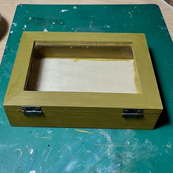 箱の底に画用紙を敷きネームプレートを作って箱の蓋に貼り付けて完成。