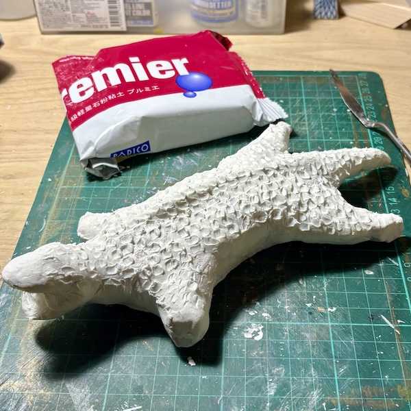 発泡スチロールに直接石粉粘土を盛り付けるよりクロスクレイで下地を作っておいた方が定着するような気がします。