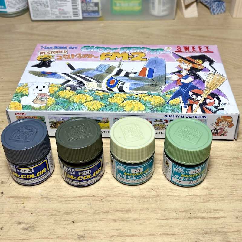 久しぶりのプラモデル制作です。FM-2は2回目の制作、少し前に購入してあったのですが中々作れませんでした。前回のFM-2を作った時も特に問題なくスムーズに組み立てる事が出来ました。予めマートレットに使用するエキストラダークシーグレーは買って用意していたのですが、塗装指示にはエキストラダークシーグレーとダークスレートグレーの迷彩となっています。ダークシーグレーとダークグリーンじゃないのか、、、クレオスではエキストラダークシーグレーは既成品で色がありましたが、ダークスレートグレーは無く、ダークグリーンに置き換えることに。この辺はもう自分の判断で自由に塗って行きたいと思います。また塗装指示の下面塗装はダックエッググリーンになってるんだよなー、海外の方からライトグレーって言われたけど、、、。今回は英国海軍のマートレットと米海軍のワイルドキャットの塗装にします。マートレットの問題は胴体と主翼のインベイジョンストライプスです、デカールで用意されているのですが、これ上手く貼れるのか?平面のデカールを立体の機体にフィットさせなければなりません。これが一番の不安要素です、最終的にデカールを貼る段階になって失敗なんてことになったら目も当てられません;汗。米海軍の主翼が黄色い空母レインジャー艦載機の塗装も魅力的ですが、筆塗りで黄色の塗装をするのがちょっと難易度が上がります。今回はブルーグレーの空母レキシントン艦載機の塗装にします。ちなみに「マートレット」とは「岩ツバメ」の事らしいです。【中古】スイート 1/144 ゴーストファイター FM-2 プラモデルキット 2機入り 14108