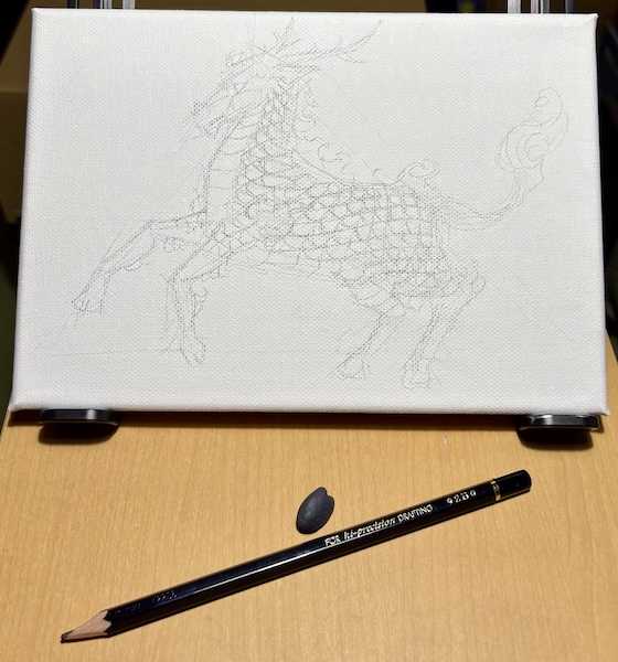 ストレッチキャンバスに麒麟の下描きをします。2Bの鉛筆で普通にデッサン、結構大まかに描いてみました。とにかく今回はチマチマ描かずに。一応ウロコはキレイに入れてみましたが、形が揃わないで部分的に大きさが合わなかったり;汗。ただこれも目安で後でほとんど消えてしまいます。ローシェンナーとバーントシェンナーで陰影を付けて行きます。今回はこの段階も大胆に描いてみます。バックにも雲を描いてみます。このように大雑把に描くのは気持ちいいものでこの時点では描いてるのが楽しいですね〜。バーントシェンナーを濃く使って少し細かく描いて行きます。この辺りから少しチマチマと描きそうになるので「グッ」とこらえてあくまでも大胆に。筆の跡もムラも気にせず描くのは気持ち良く、これで完成!だったらなんと幸せな事でしょう。こうして最初は大胆に描いていてもこの先描き進んで行く内にいつか細かく描かなきゃならなくなる時が来ると思います。その時どうやって描くかで今後の描き方が変わって行くような気が、、、。