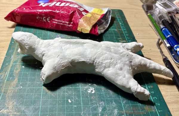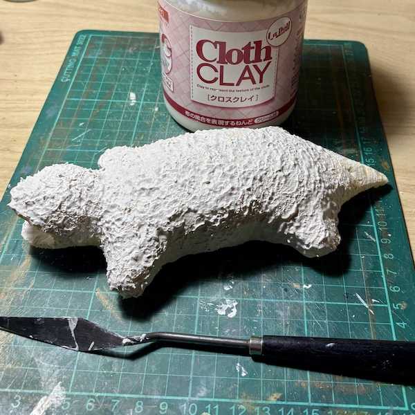 ベースの削り出しが終わったので石粉粘土で表面を覆って行きます。クロスクレイを使います、これはジェル状の石粉粘土で布などに染み込ませて乾かすと布の皺などをそのまま固める事の出来る粘土です。ペインティングナイフでペタペタと叩き塗りします。半液状なのでペインティングナイフを叩いて離す時に棘状の突起が出来ます。これを皮膚のテクスチュアとします。当初ウロコを作ろうと思ったのですが、粘度が低くウロコ状にならないので棘状の突起にしました。もっとも普通の石粉粘土で覆えばペインティングナイフでウロコらしい模様が出来たのかも知れませんが、面倒くさいのでwwwこれも乾かすのに1日置かなくてはなりませんでした。ドライヤーなどで乾かすもなかなか乾かず完全に乾くまで待ちました。表面のクロスクレイが乾いたので四肢と尾を普通の石粉粘土で作ります。今回自宅のベランダに吊るす鳩避けとゆう事もあり、かなり雑に作ってます;汗。この四肢や尾を作った石粉粘土を乾かすのにまた一晩置いておきます。石粉粘土、乾かすのに時間がかかります。四肢と尾が乾いたので下面、お腹側にクロスクレイをペタペタ塗ります。乾い四肢と尾にもクロスクレイを塗ったり、普通の石粉粘土を盛って徐々に形にして行きます。そしてまた乾燥、、、。石粉粘土 ラドールペースト 301281 | ねんどパジコ 石塑粘土 ラドール プルミエ 300g