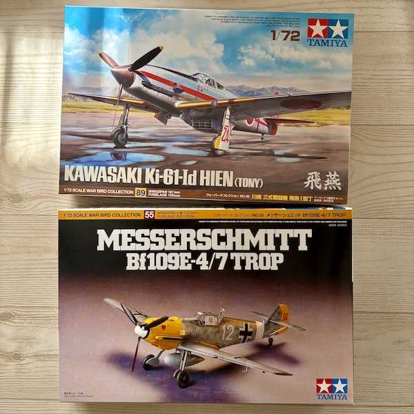 先日亡くなられたタミヤの田宮会長を忍んで何かタミヤのプラモデルを作ろうと思っていました。以前から作ってみたいと思っていた飛燕とメッサーシュミット109Eをゲット、この2機はなんか似てないですか?ランディングギアの引き込み方式こそ違いますが、飛燕のエンジンはダイムラーベンンツのエンジンをライセンス生産したとゆう事なので機種の形状がそっくりです。いつか作って並べてみたいと思っていました。メッサーシュミットはトロップ型のコンパーチブルなのですね、トロップ塗装にも興味がありますが今回は、例によって説明書通りの塗装にしません。2機一緒に作るので、国籍標識を入れ替えてそれぞれの国の塗装なんてのも面白いかもしれないのですが。ちなみにメッサーシュミットの箱写真にはハーケンクロイツが貼ってありませんが、キットのデカールには付属しています。もっとも今回は使いませんが、、、。タミヤ【プラモデル】1/72 ウォーバードコレクション No.55 メッサーシュミット Bf109 E-4/7 TROP H-4950344607556タミヤ 1/72 ウォーバードコレクション 川崎 三式戦闘機 飛燕I型丁 【60789】 (プラモデル)