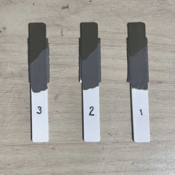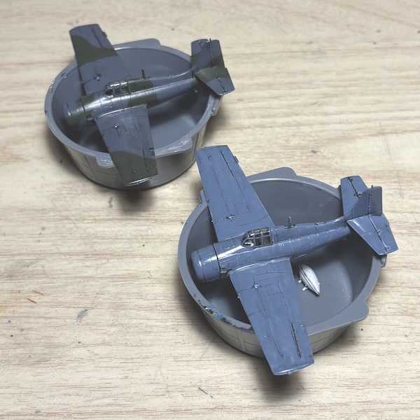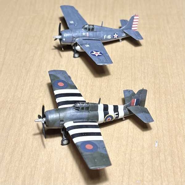マートレットとワイルドキャットの塗装に入りますが、英国海軍のマートレットの塗装指示がエキストラダークシーグレーとダークスレートグレーのカムフラージュとなっていますが、ダークスレートグレーをダークグリーンに変更したのでコントラストの調整をおこないます。ダークシーグレーとダークグリーンのカムフラージュでは結構コントラストがあり、はっきりした迷彩になっているのですが、エキストラダークシーグレーとダークグリーンではコントラストが甘く境界が曖昧になってしまいます。まぁそれはそれでも良いのですが、模型的にもう少しコントラストを付けたいと;汗。クレオスのエキストラダークシーグレーにライトグレーを混ぜて明度を上げて行きます。“エキストラ”と冠しているので結構暗い色です、戦後の英国海軍機のエキストラダークシーグレー一色の塗装ならそのままでも良いのですがカムフラージュにするには暗すぎます。ある程度コントラストが付くまで明度を上げて、この辺はある程度自由に色を作ってしまいます。同様に米海軍のブルーグレーもクレオスで出ているのはちょっと暗いので実機の画像や動画などを参考に自分なりのイメージで明度を調節します。自分的にはプラモデルの塗装の色合わせはかなり自由に塗って行きたいと思います。マートレットとワイルドキャトの塗装が完了。マートレットはインベイジョンストライプス(白黒の帯)のデカールが来る部分は迷彩塗装をしていません。迷彩塗装しても良いのですが塗装指示の迷彩パターンが他のどの英軍機の迷彩パターンとも合わないので塗装指示の見える部分のみの迷彩塗装にしました。両機とも塗装にかなり艶がありますが後からフラットクリアを塗るので特にフラットベースなどは混ぜません。
