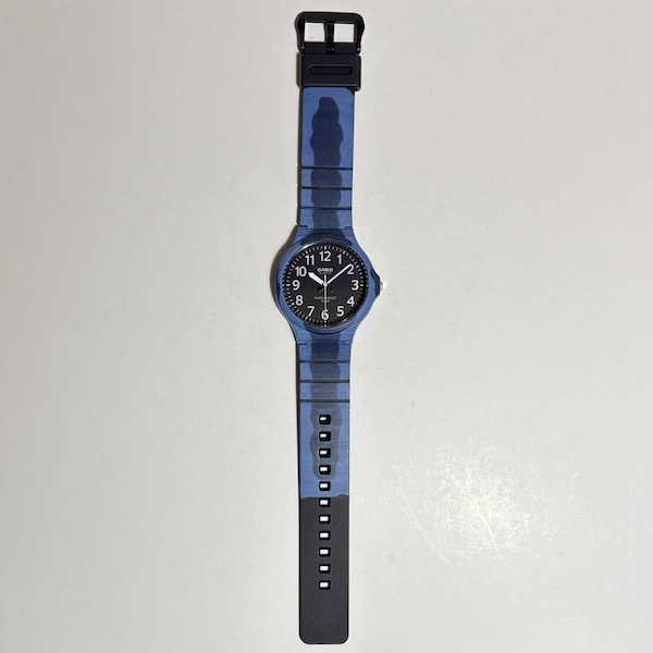 カシオスタンダードの黒文字盤に航空自衛隊機の洋上迷彩を塗装しました。プラモデル用のクレオスのMr.カラーでケースやバンドを塗装しましたが、バンドのラバーにはプラモデル用の塗料そのままでは定着しません。予めラバーのバンド部分にウレヒーロのウレタン塗料を塗装。長年ゴムに塗れる塗料を探していたのですが、売り場でゴム手袋にウレヒーロが塗装されたサンプルを発見!触ってみると確かに定着しています、試しに引っ掻いてみても(サンプルなのでご容赦を;汗)全く剥がれることもなく。これはと思い溶剤と共に即購入、ちょっと金額が高いのですがやっと探していた塗料を見つけました。これ何度か試した結果、やはり薄めて塗った方が綺麗に塗れます。濃いまま塗るとかなり筆跡が目立ちます。しかも長い事使わないと結構溶剤が飛びます。溶剤などは使ってないのに目減りします;汗。これをプライマーにして乾いたウレヒーロの上にクレオスのMr.カラーを塗ります。洋上迷彩のシャロウオーシャンブルーとディープオーシャンブルー、これらは零戦を洋上迷彩にするために取り寄せた物。洋上迷彩を塗装し終わってそのままの色では綺麗すぎるで“ウェザリング”もしてやりましたwwwこれもあまりやり過ぎると汚くなるのでほどほどに;汗。最後に艶消しクリアをかけて完成。早速オークションに出品していますので宜しければご覧下さい。チープカシオ 洋上迷彩マイオークションページ斎藤塗料 ウレヒーロー ラスクリ ブラック 全ツヤ消し 15ml 1個 塗料 1013 M-2 4580524960203GSIクレオス Mr.カラー 飛行機模型用カラー シャロウオーシャンブルー 半光沢 10ml 模型用塗料 C374 クレオス 塗料GSIクレオス Mr.カラー 飛行機模型用カラー ディープオーシャンブルー 半光沢 10ml 模型用塗料 C375 クレオス 塗料
