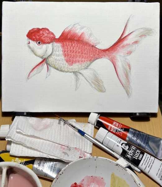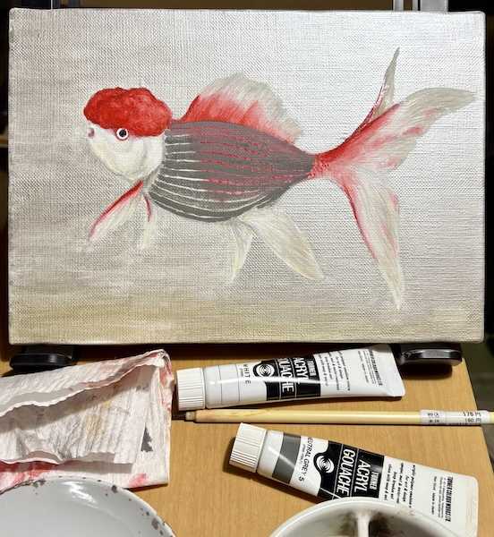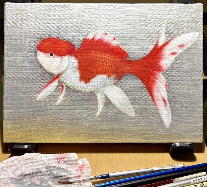 透明に溶いた絵の具を水彩のように乗せていきます。頭部のコブや鱗にも調子を付けていきます。今回鱗の下描きはあえて描きませんでした、鱗を下描きしてしまうと描いているうちに鱗の並び方に狂いが出てきたりしてしまいます。このまま“水彩風”に描くつもりはないのですが、一瞬キャンバスに水彩風に描いてみるのも面白いかもと思ったりします。しかし下に描いた鉛筆の線が消えないので、もし最後までキャンバスに水彩風に描くのであればいかに下描きの線を目立たなくするかが問題になりそうです。ある程度金魚に色を乗せた段階でバックにも色を乗せていきます。今回も金属色のシルバーで塗ります。昔、子供の頃集めていた切手に魚のシリーズがあり美しい魚の絵のバックが銀色だったのを思い出しました。その記憶でバックを銀色に塗っているのではありませんが、描いていてふと思い出したりしました。バックもシルバーを薄く溶いて塗りますが最初の段階ではひどいムラが消えません。何度か塗って不透明に近づけないとムラを消すことが出来ず、キャンバスで水彩風に描くとなるとこの辺のムラも問題になりそうです。