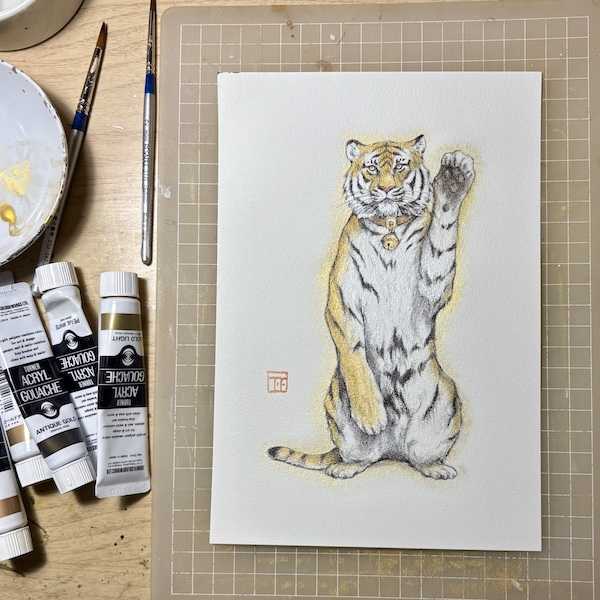 鉛筆で描いた「招きトラ」に彩色します。鉛筆で描く時よほど虎斑を描かずに彩色の際に虎斑の代わりに何か模様にしようと思ったのですがやめました;汗。今回トラの色を金や銀で塗ってみたくなりました。まずは金色で彩色、虎の黄色い部分をライトゴールドやディープゴールド、オレンジゴールドなどで塗り胸や腹の白毛の部分はパール系のホワイトで塗ってみました。虎斑の黒い部分もパールブラックなどで上塗りしています。鉛筆で描いた際、顔の部分など色を乗せるのを忘れて陰影などを描き込み過ぎて、実際色を乗せる時に発色に影響してしまいました。ある程度トラに彩色し終わってバックに色を置かずに画用紙の色そのままで行こうと思いましたが、やはり寂しいのでバックにも色を乗せる事に。バックの色もグリーン系など色々と塗ってみましたが、イマイチだったのでトラ本体と同系色の金色を薄く塗ってドロップシャドウのようにしてみました。首にかけてる鈴も本来ならイエローオーカーやローアンバーなどで金色を表現するのですが今回はゴールド系で塗ってみました;汗。金色の招きトラ、神々しくてありがたみがありそうですwww続けてホワイトタイガーのイメージでシルバー系の招きトラも彩色しました。トラの黄色い部分にシルバーで塗りやはり胸や腹の部分はパール系ホワイト、虎斑にはペール系ブラックを塗ってあります。そしてやはり普通の黄色系の招きトラも彩色。招きトラだけで3種類の彩色になりました。インクジェットプリントに彩色ならではこんなふうにバリエーションが出来るので面白みがあります。宜しければオークションページをご覧ください。招きトラNo.01招きトラNo.02招きトラNo.03マイオークションページ
