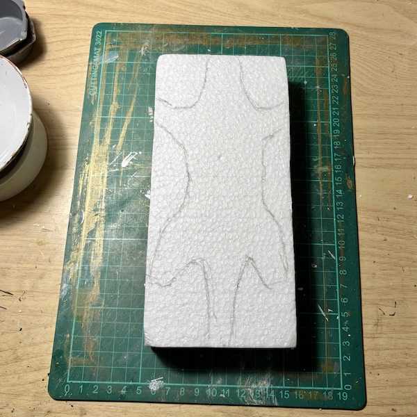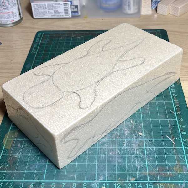 百均で仕入れてきた発泡スチロールに防鳩1号を削り出す為の当たりを付けます。こうして当たりを付けたからと言ってほとんど消えてしまい、あとは勘で削り出すしかないのですが;汗。さて実際削ってみるとこれがなかなか削りにくい、発泡スチロールなので簡単に削れるかと思ったのですが。しかも多量の発泡スチロールを削ったゴミが出るし、細かい屑が静電気でくっつくし;泣。最初大きめのカッターの刃を長めに出して削るも上手く削れず、刃を手前に向けると勢いで怪我をしそうになるのでカッターで大まかに削った後、以前手に入れたウッドバーニング用の機材で溶かして行きます。これとて発泡スチロールカッターではないので先端に付ける針金が短いのしかなく、細かく溶かして行くしかありません。なんとか形になるように溶かし削りましたが、これ買っといて良かった~www今ではウッドバーニングなんてやらないので出番がありませんでした。荒削りが終わって荒目のサンドペーパーをかけてベース完成です。この後石粉粘土で外形を整えて行きます。【秋インテリア祭 開催中】マイペン ハッコー FD200-01 初めて挑戦する方にもやさしい電熱ペンです。ウッドバーニング用電熱ペン。 BFJ1029632グット goot 発砲スチロールカッター コードレス 電池 電池式 発泡スチロール カッター 切断 カット 模様切り スチロールカッター SC-10 太洋電機産業 4975205440141