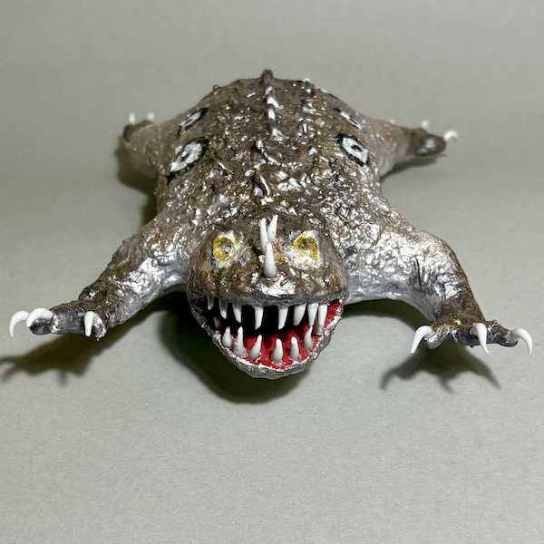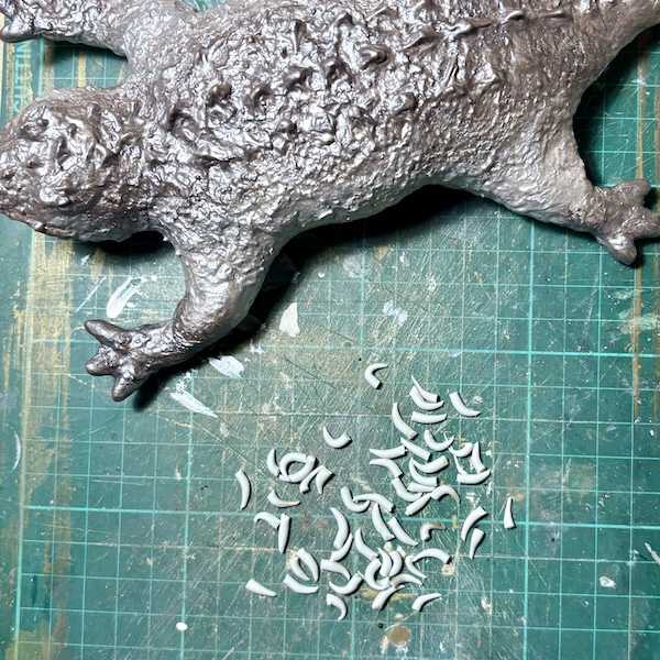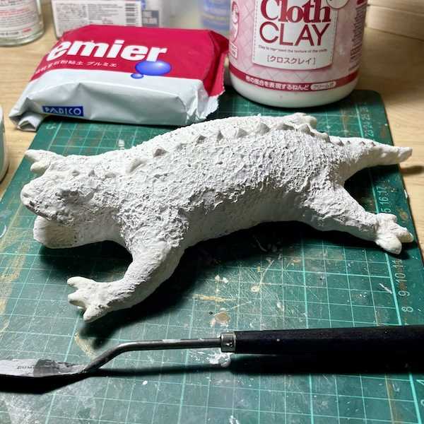 下地のクロストレイや追加の四肢や尾が乾いたので徐々に細部を作って行きます。手や足、顔の部分にもそれらしい部品を付けて行きます。背中に怪獣らしいスパイクを追加。スパイクも本来は石粉粘土で型作ればいいのですが、何しろ適当に作りますので;汗、クロストレイをペインティングナイフでペタッと盛り上げました。一列じゃ寂しいので3列に。顔にもスパイクを追加、目の部分の膨らみも追加。これでカエルみたいだった見た目が一気に怪獣らしくなりましたwwwそしてまた乾燥、、、。