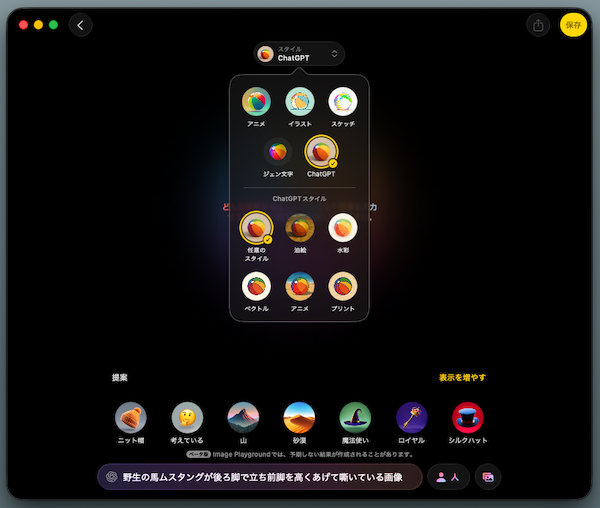 先日のMacOSのアップデートでTahoeになったので前回ダメダメだったImage Playgroundも変更があったのかな~と半分期待しないで試してみました。ん?前回より選択肢が増えてる、確かChat GPTの画像生成は無かったような気が、、、。試しに「野生の馬ムスタング」の画像をプロンプトで指示して画像生成してみました。しばらく待つとおお!今回はマシな画像が生成されました!さらに背景をグランドキャニオンのような風景に指示するとアメリカの野生の馬、ムスタングのイメージ通りの画像がで出来ました。いいじゃないですか~、今度のImage Playground。さらに何か作ろうとしたら、やはり1日の上限に達したとのお達し;汗。え?Appleのソフトの中でもダメなの?じゃデバイスを変えてみたら?と思ってiPhoneでやってみるも同じ結果。それにしても上限に達する画像の量少なくね?いい感じだったんですけどね~、惜しいなぁ残念でしたまたどうぞwww