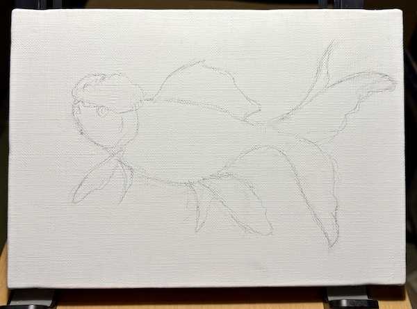 SM(サムホール)のキャンバスに描いていきます。鉛筆で全体のバランスを見ながら描きます、何度も言いますがSNSなどで見かける海外の方の制作動画ですが全体を見ずに目なら目のいきなりピンポイントから描いて、しかもその部分をほぼ完成させてしまいます;汗、それでいて絵が進んで行くとちゃんと全体のバランスが取れた絵になって行くのです。感心すると共にどうやってバランスを取るんだろう?といつも不思議に思うのです。そんな真似は出来ないので画面に収まるように描いた下描きを薄く溶いた絵の具で押さえます。以前「東錦・あずまにしき」を描いた時ローシェンナーで下描きを押さえたのですが、これが最後まで色の影響が消えなくて苦労しました。今回は普通のマルスブラックでお汁描きしました。2Bくらいの鉛筆で描いたので色を置いた際に下描きが動いて色が濁らないように押さえます。そして今回は最初の段階で透明水彩のように絵の具を薄く溶いたお汁状で色を置いてみます。今まではこの段階でかなり不透明な絵の具でキャンバスを覆い隠すように塗ったのですが。もちろん最後までキャンバスの上に透明水彩風に描こうとは思っていませんが、描き方を変えて自分に合った描き方があるならその方が良いかと思います。油絵じゃないのでセオリー通りに描かないといけないとゆう事はないのです、油絵の場合描き方を無視すると後で亀裂が入ったりしますからね~;汗。