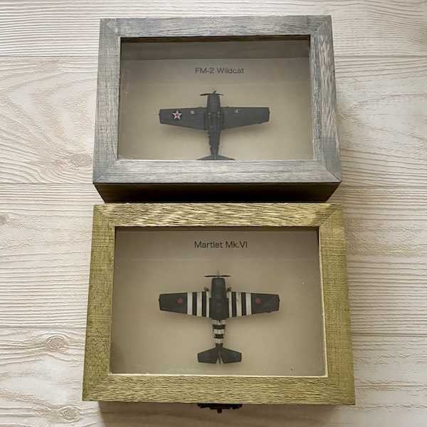 完成したマートレットとワイルドキャットを収納する格納庫を作ります。収納ボックスを個人的に格納庫と呼んでいます。いつものように百均で手に入れたアクセサリーボックスに塗装します。英海軍機のマートレットには米軍機の機体内部色を塗ってみたところ、あまりにも機体内部色然としたのでさらにダークグリーンを乗せてみました。ややカーキ色っぽくなりました。米海軍機のワイルドキャットの格納庫はニュートラルグレーで塗ってみました。底面に画用紙を敷き、ネームプレートを印刷して化粧します。今回このFM-2には車輪止めが付いているのでこれを敷紙に取り付けてみます。これでFM-2制作は完了です。