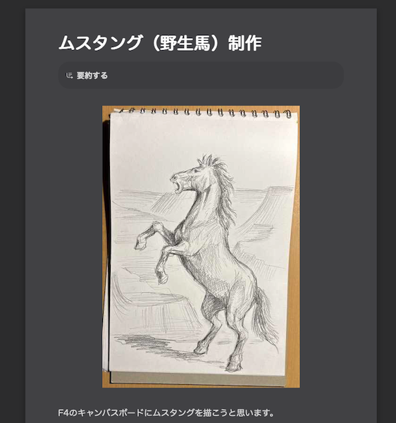 F4のキャンバスボードにムスタングを描こうと思います。ムスタングとはアメリカ原産の野生馬のこと戦闘機や車じゃありませんwwwアメリアの大地で後ろ脚で立っていななく荒々しい野生の馬、そんなイメージでAIに画像をリクエストしてみました。うん、悪くないですね~いくつか画像を生成してみます。最後に背景をグランドキャニオンにしてみてとリクエスト。おお!イメージにピッタリです!ラフスケッチを起こしてみます。AIに自分で書いたプロンプトで画像生成して、それを参考に絵を描くことは問題ないと思います。これ誰かが作ったAI画像(構図など)を参考に描いちゃダメって事だと思います。※楽天ブログ直ったみたい?でも「日記のプレビュー」にすると例の「要約」画面になりますが、、、。