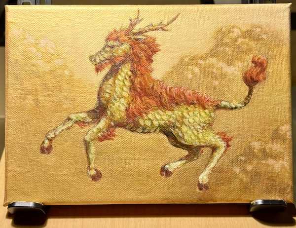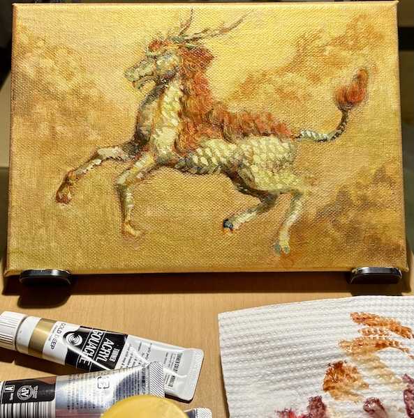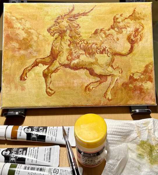 ローシェンナーとバーントシェンナーである程度描き進めて行き、全体的にグラッシしました。オリーブグリーンをポリマーメデュームで透明に溶いて画面全体にかけます。本来透明系の絵の具でグラッシしそうなもんですが、アクリルガッシュのオリーブグリーンでグラッシしちゃいました;汗。ポリマーメデュームで透明になるからいいでしょ。グラッシで色が入っていなかった部分にも均一に絵の具が入り下地を隠すような手間が省けるような気がします。グラッシで全体の色調が落ち着いた上に不透明な色でさらに描き進めて行きます。描いてはグラッシを何度か繰り返してみます。ある程度描き進めた段階でバックにゴールド系の絵の具を塗ってみます。今回はバックが一色ではなく雲を描いてみましたので雲の陰影をゴールド系で描いてみます。さらにバックのみ金色系の絵の具をポリマーメデュームで溶いてグラッシしたりします。麒麟に翼がありませんが空を走っているような図ですが神獣なので宙に浮くことも自在なのです。ここまで自由に大胆に描いてきましたが、ここからがどの方向に向かわせようか?いくら自由に大胆に描くと言っても細部が気になり出します、この後どうしましょう。