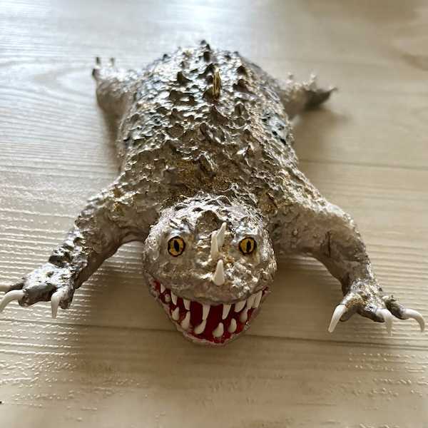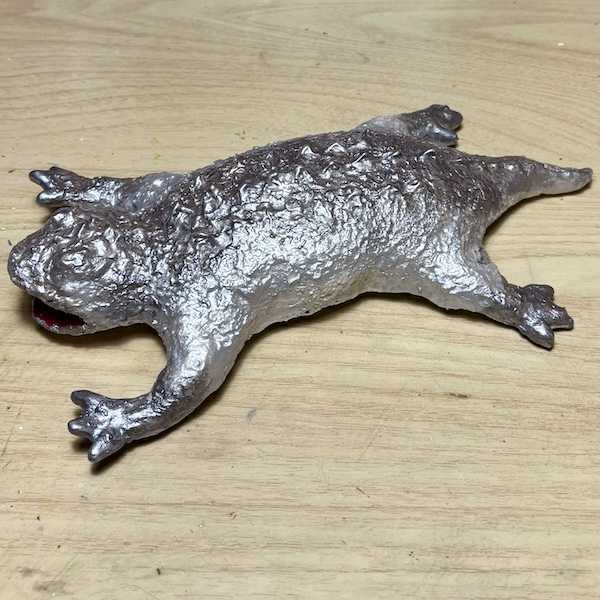 形状を作った粘土が乾いたのでいよいよ色を塗って行きます。アクリル絵の具でシルバー系の色を塗ります。鳩がキラキラ光るものが嫌いらしいのでシルバー系に。背中にかけてアンティークシルバーでアクセントを付けました。何やら宇宙怪獣っぽい雰囲気にwwwまだこの時点ではカエルっぽさが抜けません;汗。シルバー系にすると皮膚のテクスチュアが際立ちます。アクリル絵の具なのですぐ乾くので上面を塗り終え、下面の塗装。四肢をやはりアンティークシルバーでアクセント。後は自然乾燥。
