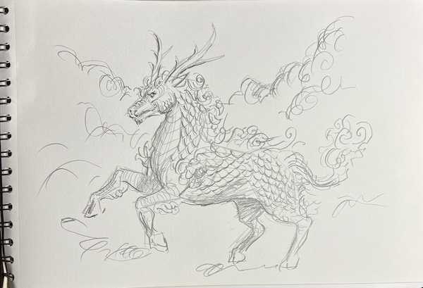 麒麟をスケッチしてみました。こんな感じ?ウロコは実際はこんなちゃんと描きませんがこれでいいかな?立て髪は渦巻のイメージで。ボカシだとかムラとかあまり気にしないで、今までのようにチマチマと描かずに今回はもっと自由に大胆な筆使いで描いてみようかと。って言いながら細かいところが気になって迷って結局今までの描き方と変わらない画風になったり;汗。頭の中では完成イメージがあり、それはもう今までとは違う斬新な完成図でwwwさてどうやって描き進めようか?進行によって完成イメージが違ってきそうな気がします;汗。いきなり思うままに絵の具を置いて行くか、最初は基本的に描いて行くか。今回は実験的な描き方になるかも、、、。