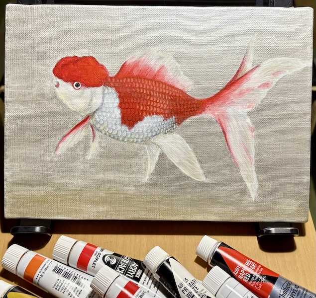 尾鰭の形状を修正し、背鰭や尾鰭に赤を足して強調。黒目も大きくしてみました。金魚の黒目ってホント真っ黒で全然光沢が無いんですよね、なのでハイライトの反射は無しです。バックのシルバーですが金魚の周囲をアンティークシルバーで影を付けそれをぼかすようにシルバーを塗って行きましたが、アクリル絵の具で綺麗にぼかそうなんてのはエアブラシでも使わない限り無理なのでアンティークシルバーを隠すようにドライブラシでぼかしてやりました。サインを入れて完成です。今回のように金魚の鱗などを描いていると、綺麗に描こうとか、形がおかしいとか、バックのシルバーのムラを気にしたりとか考えながら描くのもどうかなと思います。もっと自由に描いてみようかと;汗、まぁ基本的な形はそこそこに色をぼかしたりする事にエネルギーを費やさず、筆の跡が出ても気にしないて描いてみたくなります。乾きが早くて筆跡のエッジが残りやすいアクリル絵の具ならではの描き方があるのではないでしょうか。とりあえず当分金魚を描くのはもういいやwww