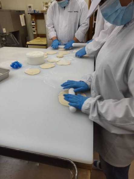 ピザパン生地を平たく丸く均等に伸ばしています。人気の塩シュガーロール。店舗では外販…