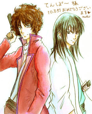 昨日は銀にゃんこ&コタにゃんこのイラストに萌えて下さった方が沢山いらしたようで拍手ポチポチいっぱい頂きましたよ~~ありがとうございました!!アクセス数も今までで一番多かったんですが一番びっくりしたのは拍手コメントをいつも送って下さる方から「ブログ村のランキング25位おめでとう」・・・・ってメッセージがはいぃ~~~?何のことですか?今までランキングなるものに参加しておきながら(うん、なんとなくね)自分の日記の更新情報が表示されてるかのチェックしかしてなかったんですけどイラスト部門の「アニメ・漫画タッチ」のランキングで昨日は25位だったそうでちょっと・・・いや、かなりびっくり今までランキングが掲載されてるページすら見たこと無かったんですよつか、自分の駄ブログがそんな場所に載るわけないって思っていたんでどこ~~~?と探して見てみたらば今日現在は26位の場所に・・・・・・・・あーーーーーーー何やら周り凄く上手な方のサイトばかりこんな場所に置いといて良いのか?めったくそ腐ったサイトなのに周りを汚染してしまいそうだな・・・・・・ごめんなさいきっと瞬間風速的な現象だとは思います。物珍しさ?きっと昨日の日記で「なんだ、これ?つまんねーーー」「腐ってるぞーーー汚染されるぞーーーーーエンガチョ!!(死語)」・・・って今日はきっとガクンと下がるぞ・・・・(←めったくそに後ろ向き)それでも良いやーーーーー我が道・・・腐道を行くぞーーー!!おーーーーー!!なにはともあれ、足を運んで下さる方々皆様に愛を!!(←要らねェ!!)ありがとうございます!!これからも宜しくお願い致します!!・・・・って前置き長すぎだボケェ!!すみません本題はこれからでございます10万アクセスのお祝いをまたまたまた頂きました!!柔らかいタッチのアナログ絵が素敵なmaRuの素/maRu様から・・・・・・・・坂本&桂てんぽ~が頂いたイラストですお持ち帰りは厳禁ですよ~~もっももも・・・・萌えェェェェ!!ちょ・・・・・渋いわっ格好良いわっ坂本っさん!!桂さんも美人~~~~~♪とても野○ソした人とは思えない(←それを言うなや)キリリとした美しさ!!実はお祝いにリクエストを聞いて下さるとの事でしたのでお言葉に甘えてこの二人をお願いいたしました。maRu様は坂本っさんを応援し隊の主催もされているので、お願いするのはこの二人しかいない!!と。てんぽ~の我儘に答えて下さりありがとうございました!!ここから腐論入りますからねご注意を坂本っさんとヅラさん「銀魂五年生」にも坂本さんはヅラさんの協力者として紹介されてるのに全っっ然絡むシーンがないのが寂しいですよ。エリザベスを連れて来てくれたのは坂本っさんだし物資や資金面で援助をず~~~っとしてくれてるはずだよね?史実の坂本竜馬と桂小五郎の関係みたいに。きっと、バイトとかしなくても十分活動は出来るんだと思う。ヅラさんがやってる訳の分からんバイトは資金面に苦労してやってるんじゃないと思うよ。「市井の事情に疎くて世の中を変えられるはずがなかろう」とか「生きた情報は自分の足でつかまねばな」とか何とか・・・・・・ヅラさん本人は大真面目でね。坂本っさんは「まっこと、めえった男じゃのぉ」(本当に困った男だなぁ)って、アッハッハッハ~と笑いながら「好きにすりゃあ しょうえい(好きにすれば良い)ほうでなけりゃあ ヅラがやない」(そうでなければヅラじゃない)なんて、にこにこ見守ってるんじゃないかなぁ~桂が何をやってても、丸ごと支える度量の大きい男が坂本っさんヅラさんは坂本っさんの事を「黒モジャ」とか「バカ本」とか呼んでるだろうけど坂本っさんの存在そのものに癒されてるんじゃないかと。・・・・・そんな風に妄想・・・・・・・・。銀桂は外せない主軸なんだけどひそかに坂桂推奨派だったりする・・・・・・。あ・・・・maRu様、腐妄想くっつけちまってすみません。maRu様はノーマルな方なのに!!いや、ホント、マジですみませんっ!!!萌える坂本&桂、ありがとうございました!!!