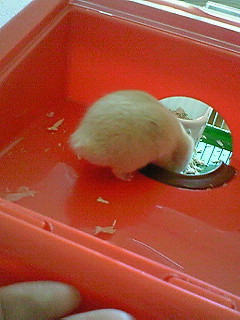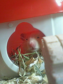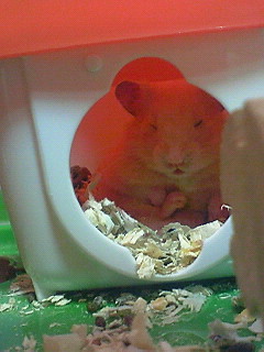 まだケージ越しの写真ですが我が家の小さいアイドルきんちゃんの写真を公開しま~~~すきんちゃんはキンクマハムスターゴールデンの変種だそうですジャンガリアンよりも一回り大きく寿命もその分1年ほど長く2~3年くらい生まれたのは昨年の12月の上旬性別は不明・・・・たぶん男の子じゃないかとまだ小さいんですが、これからもう一回り大きくなるんですって楽しみですでは~~~写真いきます~~~~ちょこちょこ動き回るんで、ちゃんと真ん中に写ってないんですが~~~まだ眠いよぅ 寝る時はここで毛糸玉みたいに丸くなってます呼んだ~? はふはふしながら寄ってくるようになりましたなになに?何かくれるの? ちょ・・・落ち着け、きんっ!こうやってちょこちょこ寄ってくるのってめっさ可愛いですね~~~落ち着きがないのがまた何ともラブリー♪・・・で餌をあげた時の決定的瞬間(笑)わ~~~い♪おやつ おや・・がぶがぶがぶ口のサイズよりもでかい餌を無理やり押し込みますちなみにこれは牧草を固めたハムスターフードいつもは↑みたいなヘン顔じゃないよ~可愛く撮れました~~~~~~~ ず~~~~っと見てても飽きないですね♪←親バカを笑ってやってくれ
