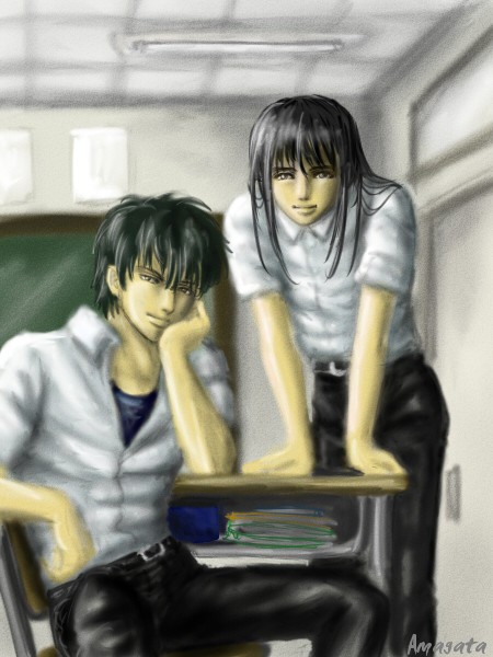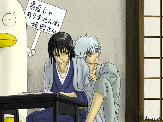 この話がくるってぇことは~紅桜編の上映が終わってしまった~~って事なんですね?まだ上映してる映画館ある?後でチェックしてみようまずは新しいOP~明るい曲ですね~久しぶりに能天気な雰囲気のOPを聞いた気がする・・・・・ヅラさんも何やら登場回数が多くて楽しい・・・・んだけど・・・・・・・何でエリーと喧嘩してんの?アニメだと揉めるのね・・・・この二人原作だとヅラさんとエリーはと~~~~っても仲良しなのに坂本っさんも久しぶりOPに返り咲けて良かったね~~~早く本編で活躍して下さいザキが目立ってた話っすよねこれ、力抜きまくって観てたんであんまり印象に残ってない(笑)だって・・・・・・・初っ端、修羅に乗せて紅桜編のダイジェストを流してたでしょそっちでトランス状態になってたから改めて観ると、随分アニメオリジナルシーンが多かったんだなぁいきなりテニプリだし武蔵みたいな人と白熱の試合してるし聞き込みしてるシーンは太陽に○えろ的なBGMつか、聞き込みする人間のチョイスが間違ってるよ、ザキ舞台変わって恒道館原作よりも一層パワーアップした感じのお妙さん紅桜編のあのしおらしさはどこへ行った(笑)要塞モードwwwSOL・・・ストーカーおしおきレーザーwwwこれで随分尺を稼いだ感が投げやりなぱっつぁん今回のセリフは「はい、姉上」と「道場の復興は?」だけ突っ込みもおとなしいな・・・姉上相手だもんなやっぱり近藤さんとさっちゃんのストーカーっぷりは笑える紅桜編観た後にこれって、ホント「これからいつもの銀魂に戻ります」・・・っていうのがぴったりな話しだったよね新しいED・・・・・シュールだ・・・・・・・ジャスタウェイにわかめエリー膝を抱えてぽつーんとスタンバってるヅラさんが可愛い♪バカハタ皇子まで加わって・・・・・・・・・・銀ちゃんの悪夢だったっていうオチがまた・・・・でおまけのシーン・・・かな?包帯グルグル巻きの銀ちゃん・・・・・と、3Z銀八先生www銀八先生のすぐ眼の前にヅラ君の席があるってだけで萌えてしまった・・・・・でもって今日のいたずら描き腐向きの1枚・・・・・・・銀桂そういうのが苦手な方はバック願います恒道館で散々な目に遭って、命からがら逃げてきた銀さん・・・・・・ちょ・・・・・・・匿え・・・・ヅラ桂「どうしたのだ、銀時」銀「あそこにいたらマジで殺されるわ。ちょっとの間匿っとけ」桂「それは構わんが」エリー『素直じゃありませんね、坂田さん』銀「ちょ・・・何勘違いしてんの? 違うからね、マジで命の危険を感じたから来たんだからね?」・・・・・みたいな~~~~~~~マジ半分、口実半分が理想www←ランキング参加中 クリックして下さると大変嬉しいです♪