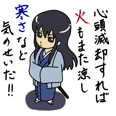 タイトルが何やら使い回し的になってますが~~~~徒然”腐”日記なんだから良いよね?インフルエンザの患者さん 今日もバンバン出ました本格的な流行ってやつっすねこんな時ウィルス・○スがいてくれたら良いのにウィルスも一発で浄化してくれるのに~~~~~~~とかマジ顔で考えるてんぽ~です今日も寒かったですでも雪国から見たら暖かい事この上ない気候の場所です寒い寒いと肩をすぼめていると桂さんに叱られそうだな~~~と思いながら今日の1枚心頭滅却しようが何しようが寒いモンは寒いです、桂さんさぁ、夕飯の支度でもしますか・・・・・・・つか、真っ先にやれもうすぐカウンターが40万になりそうですキリ番踏まれた方は何か御礼を差し上げたいので是非是非ご一報を~~~~~~~お礼は10種ランダム表示(既出イラストですが)←ランキング参加中 クリックして下さると大変嬉しいです♪