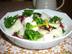 蕪とタコのサラダ カブラは、ビタミンCが多く、葉の部分にもビタミンAが豊富だそう。自作の野菜に関するレシピには、最近どうも興味がひかれる。これぐらいだったら・・・殿にでも・・・春の彩りを食卓に届けよう。1、カブラの皮をむき、3ミリくらいに切る。 塩小さじ少々をふりかけて約5分おく、水分は絞る。2、ブロッコリーは、茎も皮をむいて一口大に切り、カブラの茎と葉と一緒に塩茹でしてから冷水にとり、水分をきって茎と葉は3センチくらいの長さに切る。3、タコの足は、熱湯で約20秒ゆで、冷水にとり、水分をふいてから薄切しレモン汁をかける。4、ここから、バジル風味ソースなんだけど、バジルはもう枯れてしまったので冷蔵庫のマリネのドレッシングを利用した。5、後からブラックペッパーを少々・・・ 野菜の甘みとレモン風味の爽やかな味・・・好評やったな。(カブラは大根に、タコはエビに・・・ブロッコリーは菜の花に、バジルは青ジソに変更してもいいそう。)気が向いたらまた挑戦しよう。