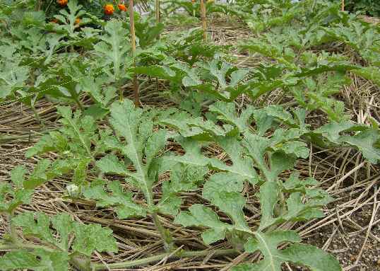 ワクワクドキドキ!!今日から雨が続きそう。去年も雨が続いたあとせっかく楽しみだったスイカにメロン・・1個、2個、3個・・・・と順調だったのに全滅!!無惨でした。今年はなんとか1個でもいい。育って欲しい。鳥の大敵も心配。ほんとにドキドキ、ワクワクなんです。単なる野菜作りなのに・・この心境は何なんでしょう。一生懸命やるからかなー心の隅にはあきらめのユトリもちょっぴり・・でもねー合唱もそうですが、下手でもベストを尽くせば感動があるんです。今日はスイカ涙を飲んで、勇気を出して1個摘果しました。一応仲間なので持ち帰ります。この前の2個はそのままで摘果しませんでした。ひょっとして枯れるかもしれないので元気な今の内に登場です。約20センチくらいになり黒皮になってきました。他のも大変なんですが、只今作戦考え中です。