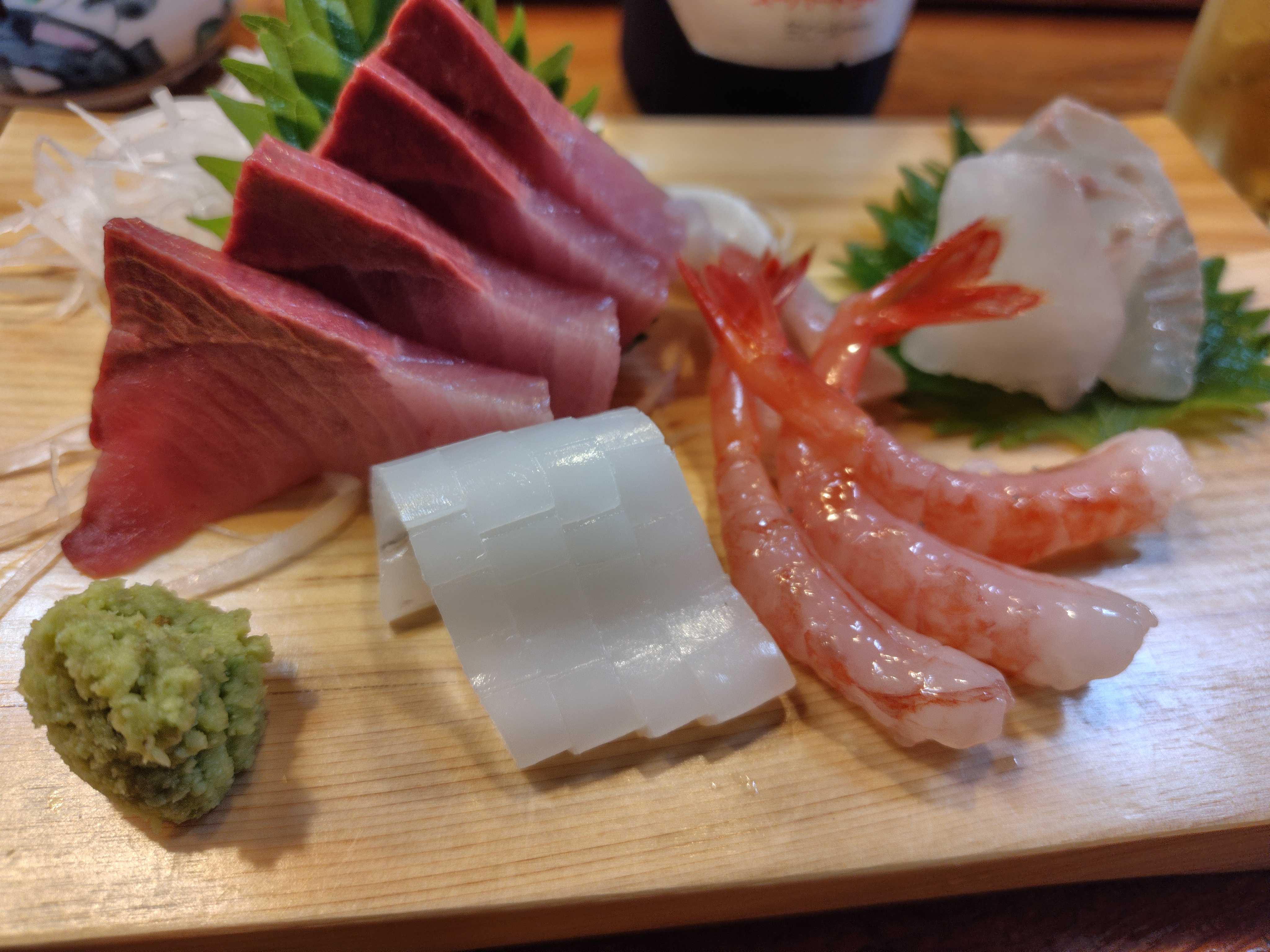 幸せな和食、甘いから甘エビ、海鮮サラダだ。