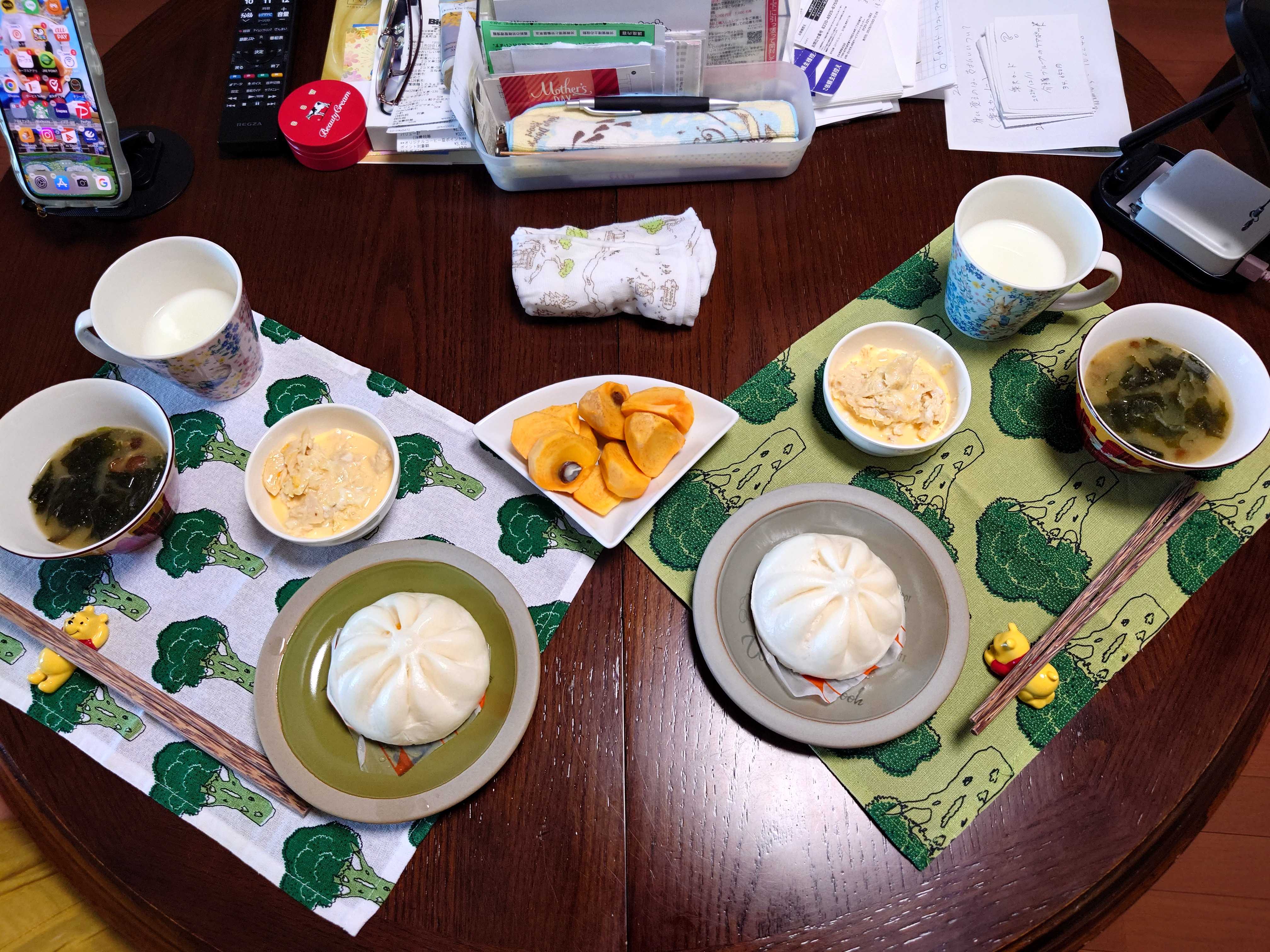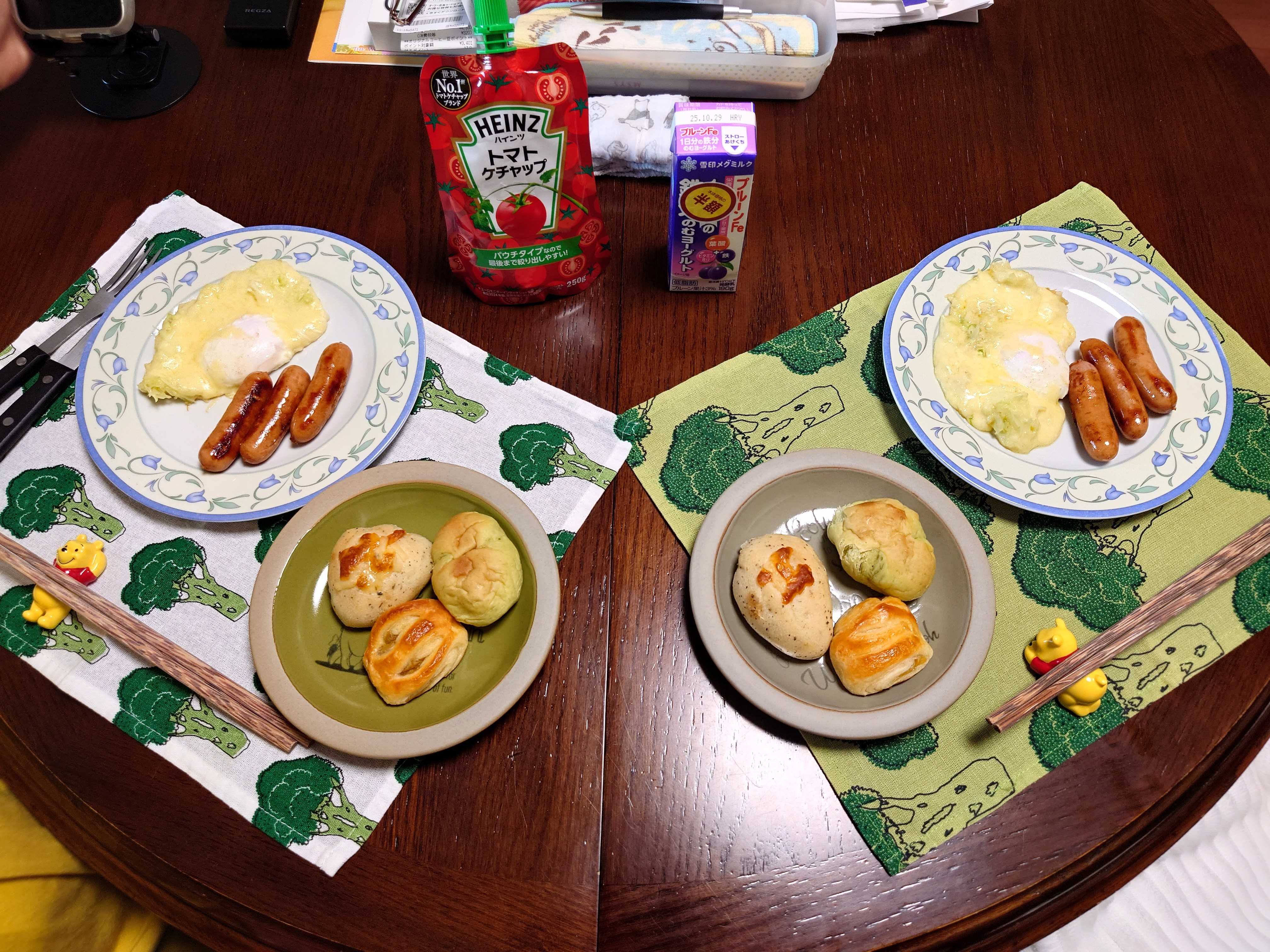 妻と仲良く朝ごはん(やっぱりダブルソフトだよねぇ~スープにつけて…