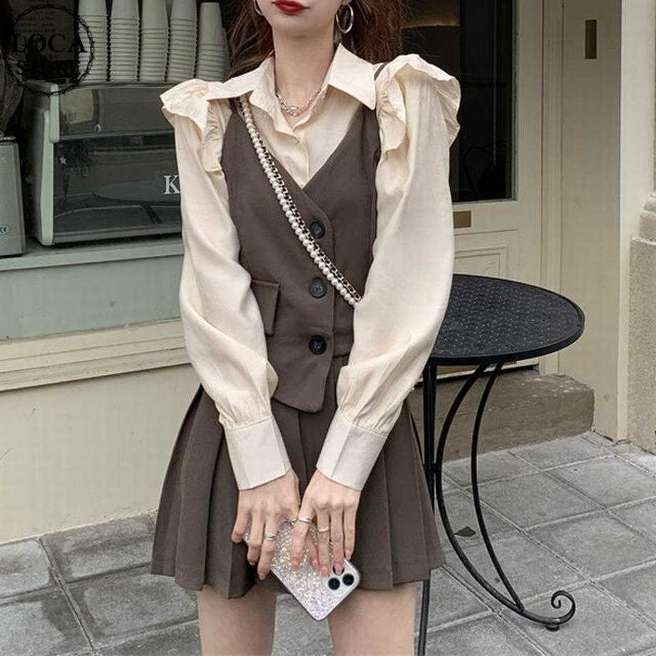セットアップ 2点セット ブラウス キャミワンピース 肩フリル プリーツ ハイウエスト 長袖 レトロ 韓国フ…