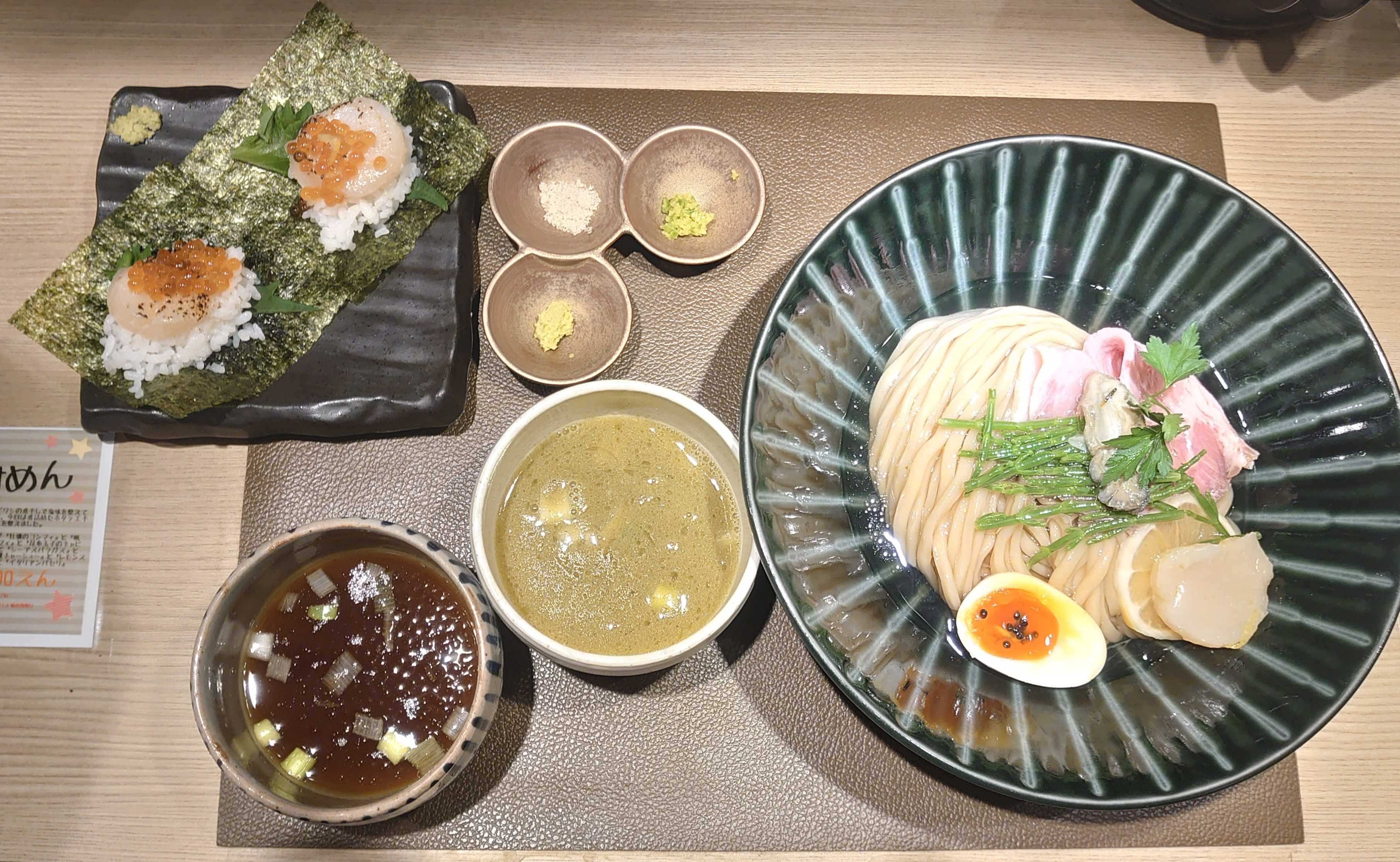 🌅ほたて日和 昆布水つけめん+北海道産いくらと猿払村帆立の手巻き…