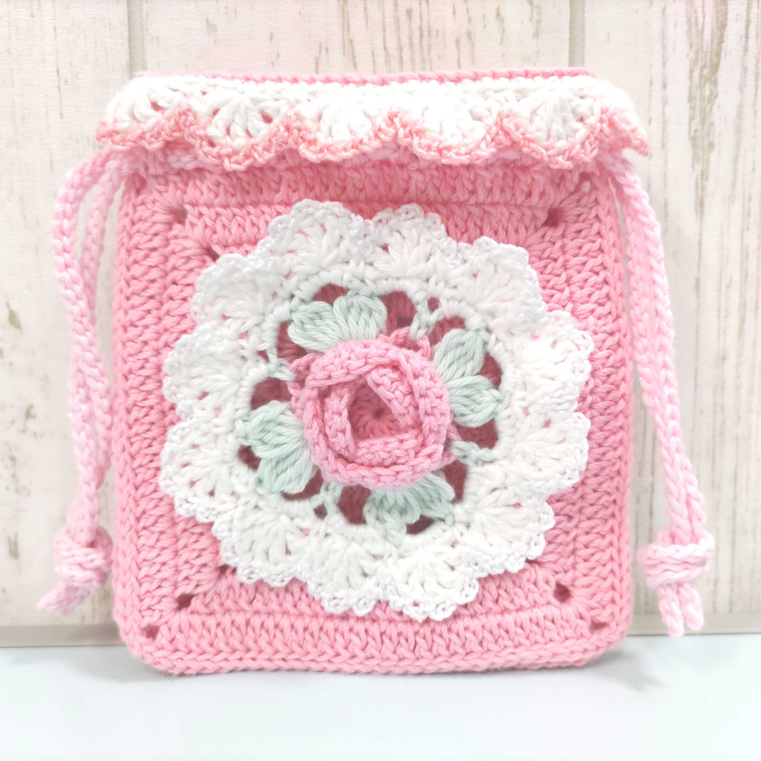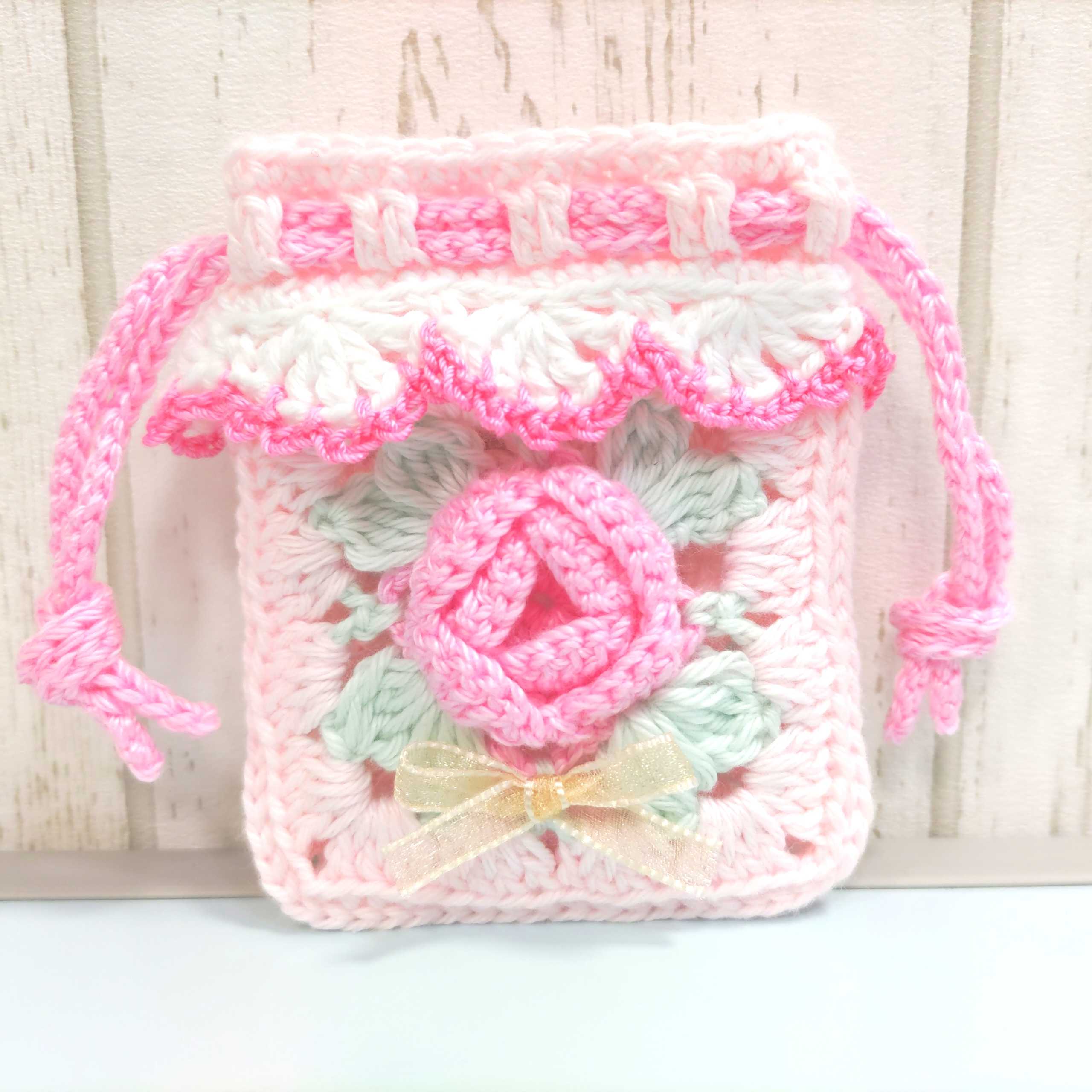 ピンクの薔薇の巾着編みました♪