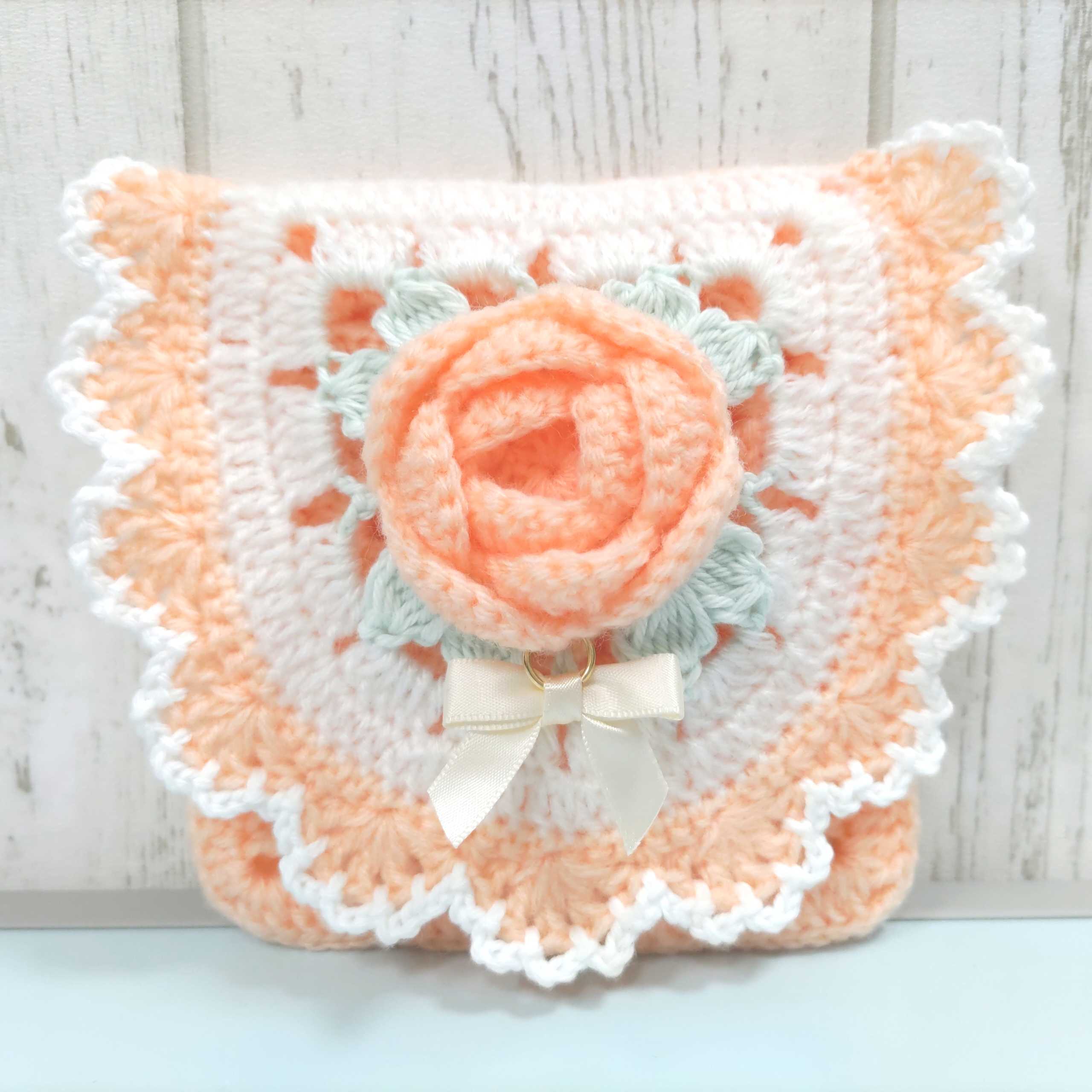 サーモンピンクの薔薇のポーチ編みました♪