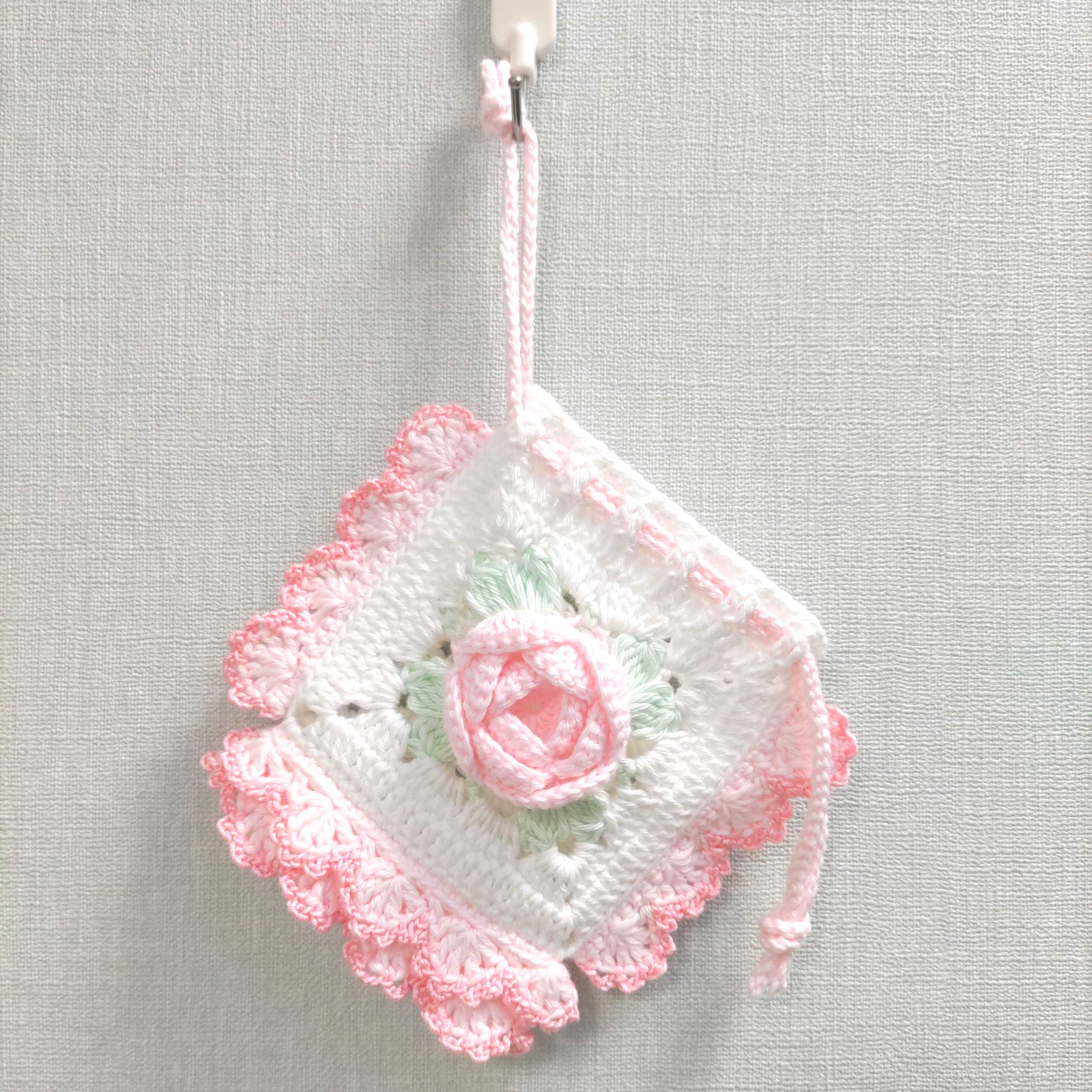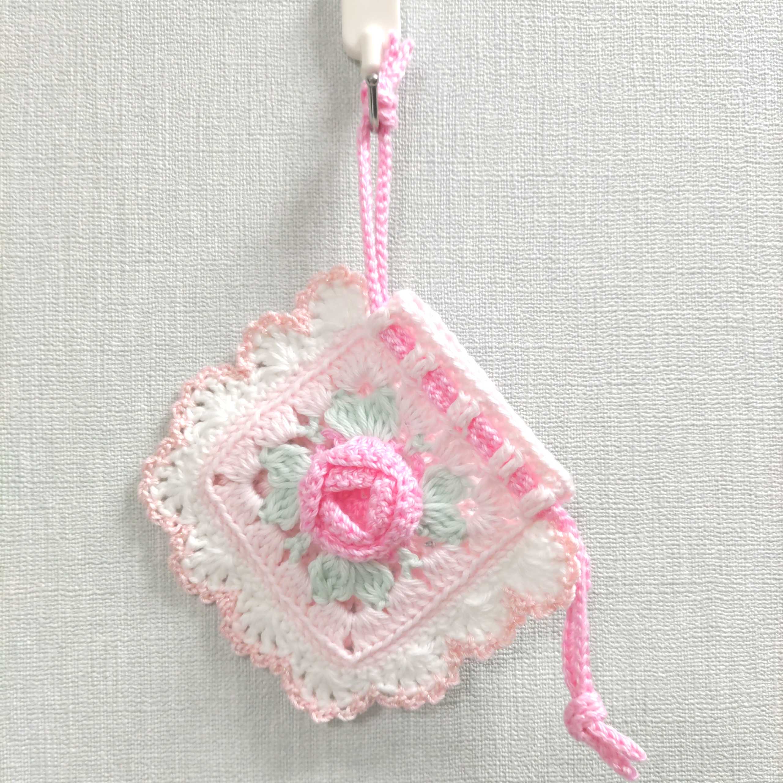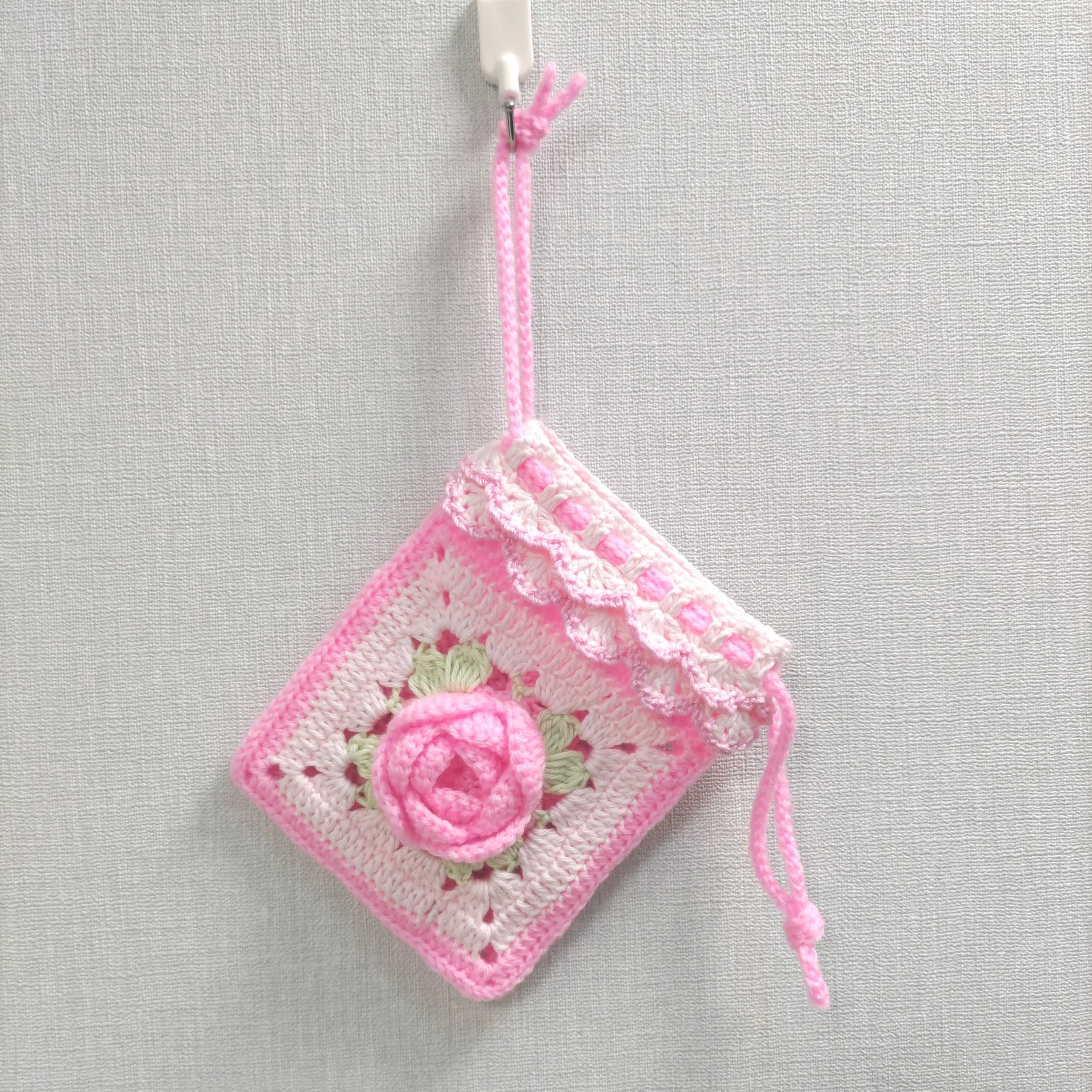 ピンクの薔薇のミニ巾着編みました♪
