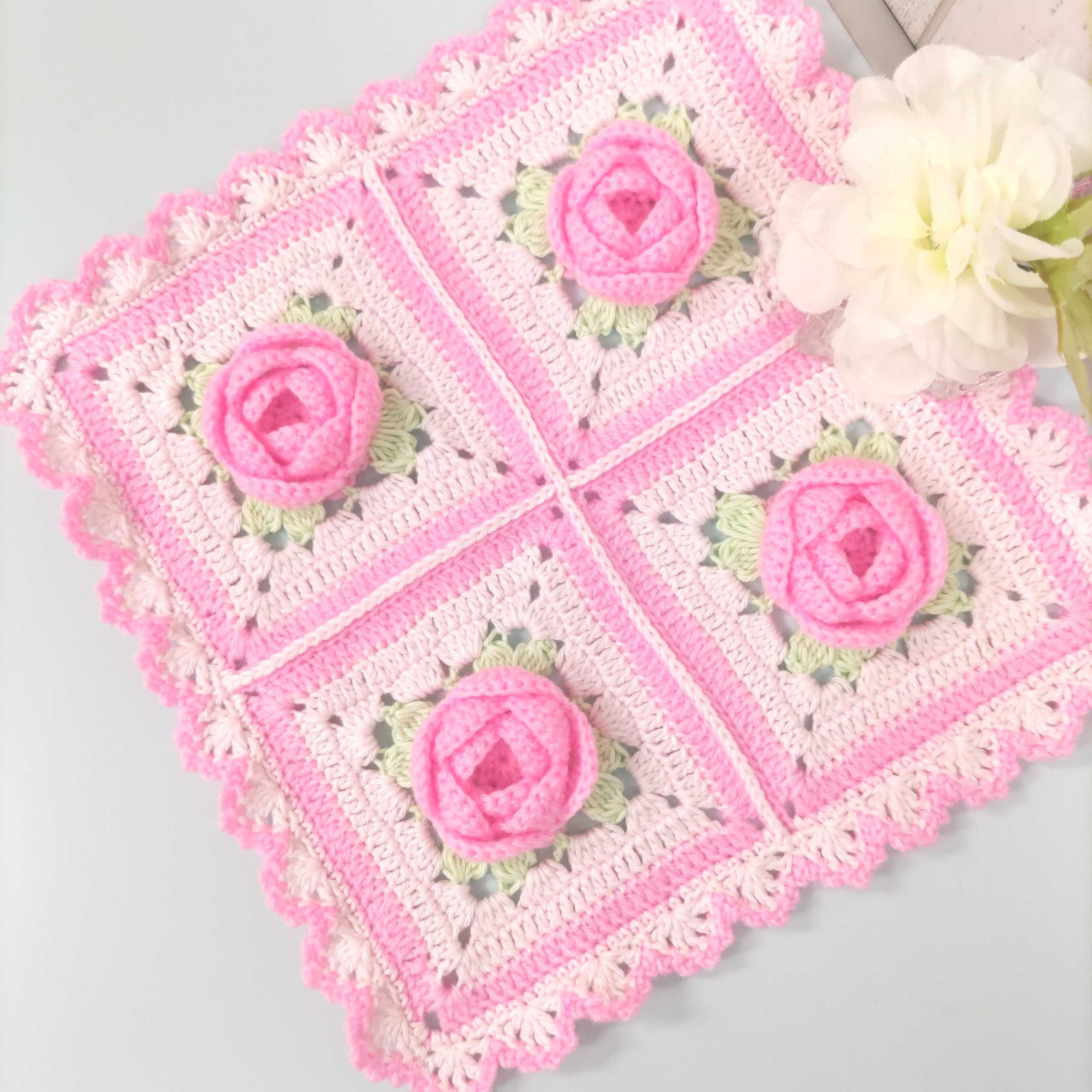 蛍光ピンクの薔薇のマルチカバー編みました♪