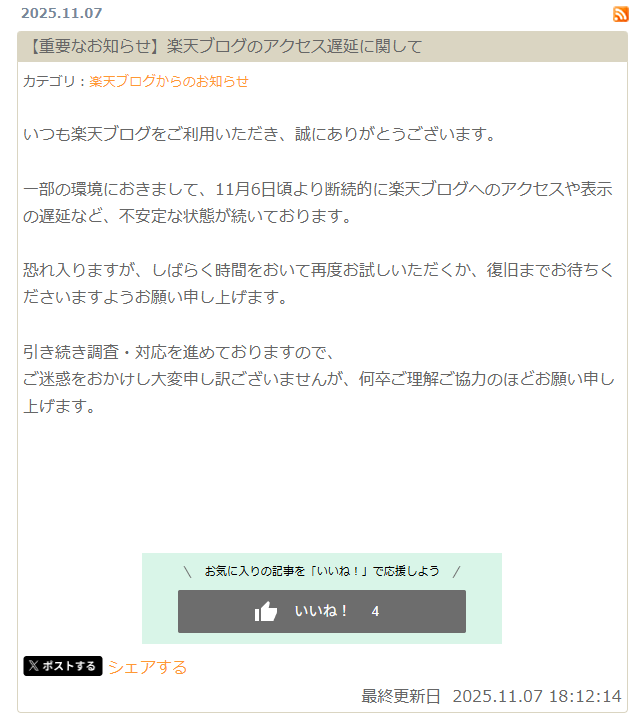 楽天ブログの遅延。まだ正式復旧はしていないのか
