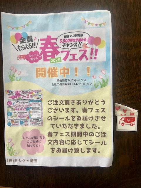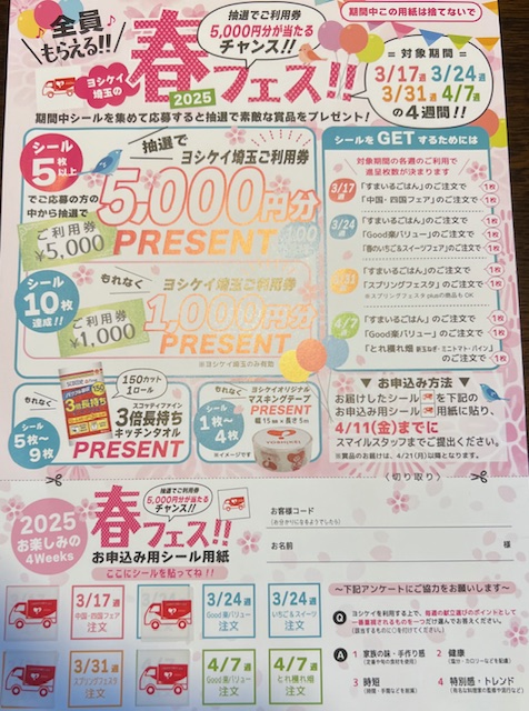 ヨシケイの春フェス。1枚貼りました。すまいるごはんを注文するだけ…