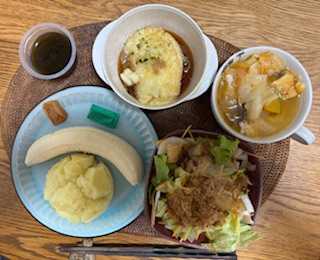 金曜日の朝食は、おいも蒸しまん、チョコレート効果、バナナ 2025.…