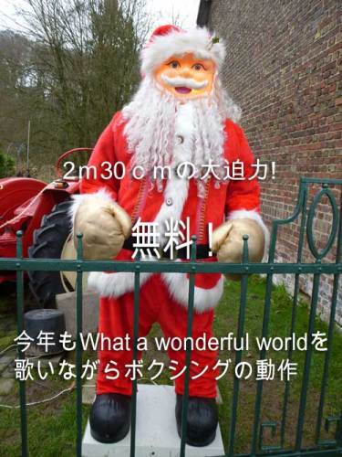無人の山の中で歌い踊る等身大サンタ。12月例年厳寒が今年暖冬で咲き…