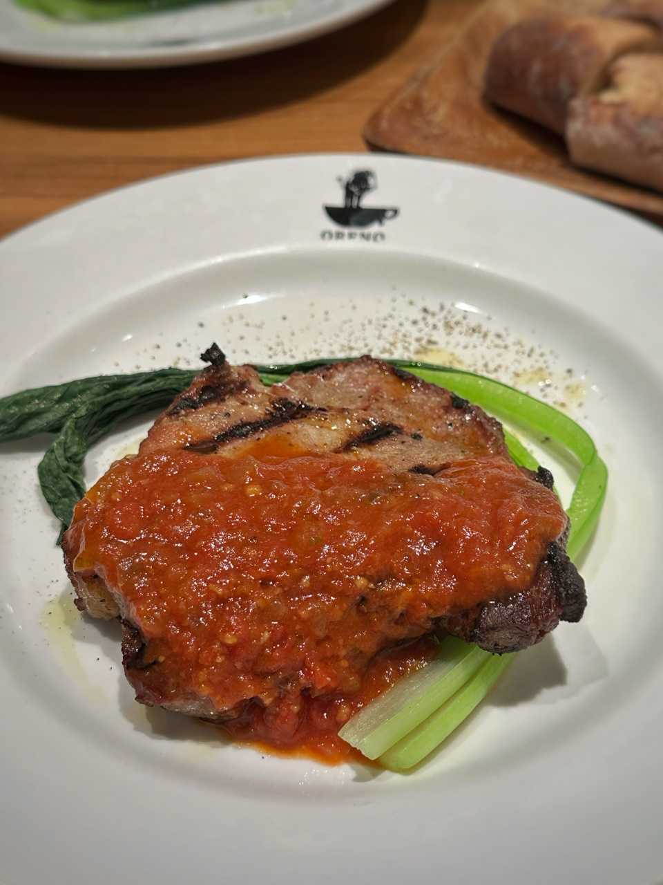 香ばし表面からほんのりピンクの分厚いロース!豚肩ロースのグリル~アラビアータソース@俺のイタリアン …