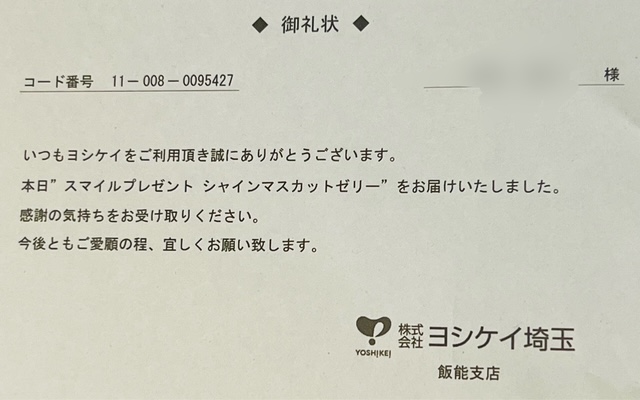 ヨシケイからスマイルプレゼントのシャインマスカットゼリーが届いて…