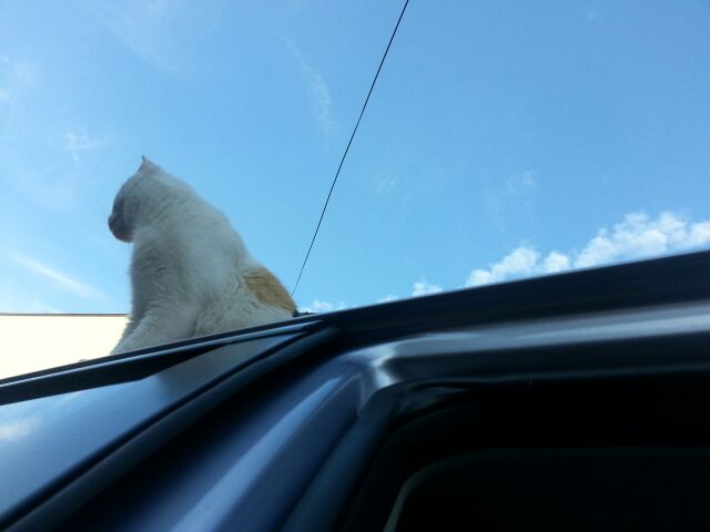 本日は定時で終了、どこにも寄らずにちゃっちゃと帰ってきました(笑)。 家に着くと、決ってミケがどこからかやって来て、ニャーニャーと出迎えてくれます(笑)。 今日は電話中で、なかなか車から降りずにいたら、バックミラーにジャンプして車に上がったミケの姿が写りました…(汗)。 天井を歩く足音(笑)、ルーフからニャーォ、ニャーォの鳴き声(笑)。 あー、はい、はい(笑)。 グリグリして~~って言われても…。 ニャー、ニャー。 (早く降りろよ)