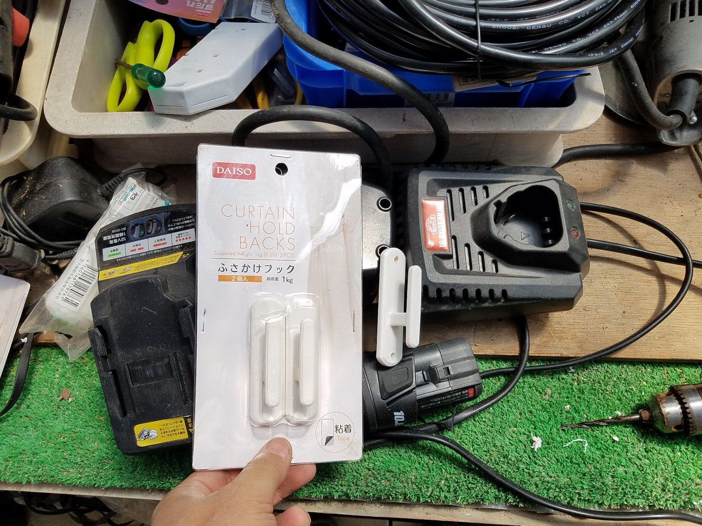ダイソーの100円のふさかけにドリルで穴を開けて、ビス仕様にしたり…