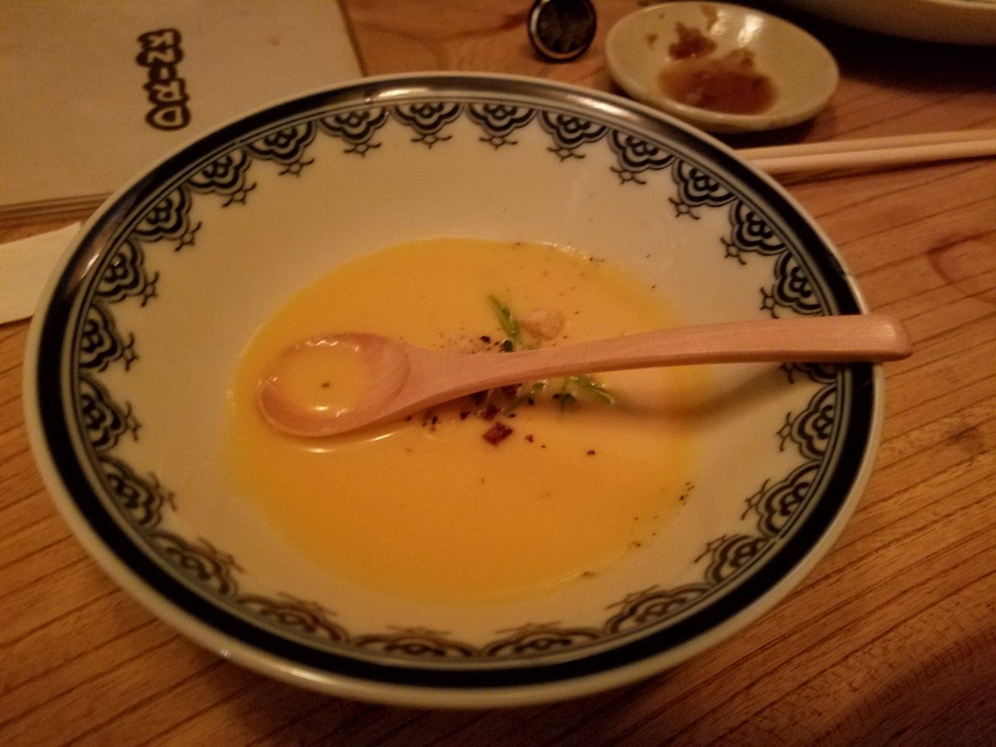 トマトの冷製スープ。○口社長の持ち込みのトマトをスープにしてくれました(笑)。