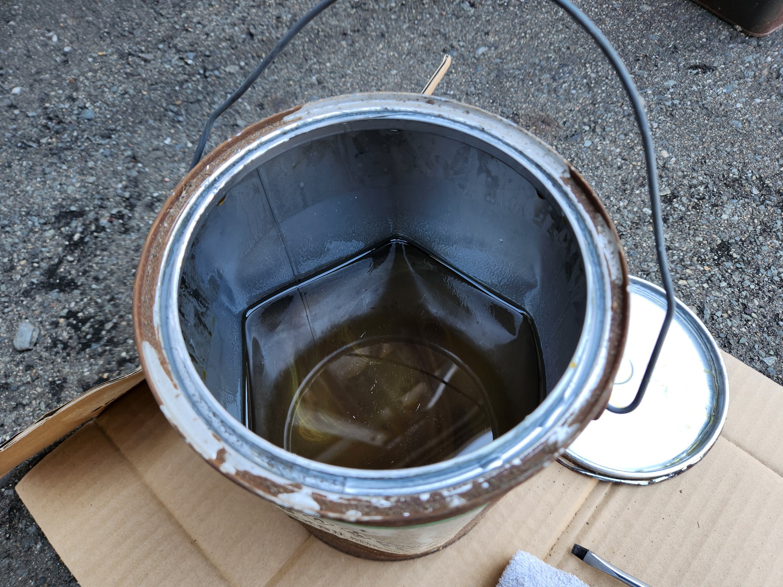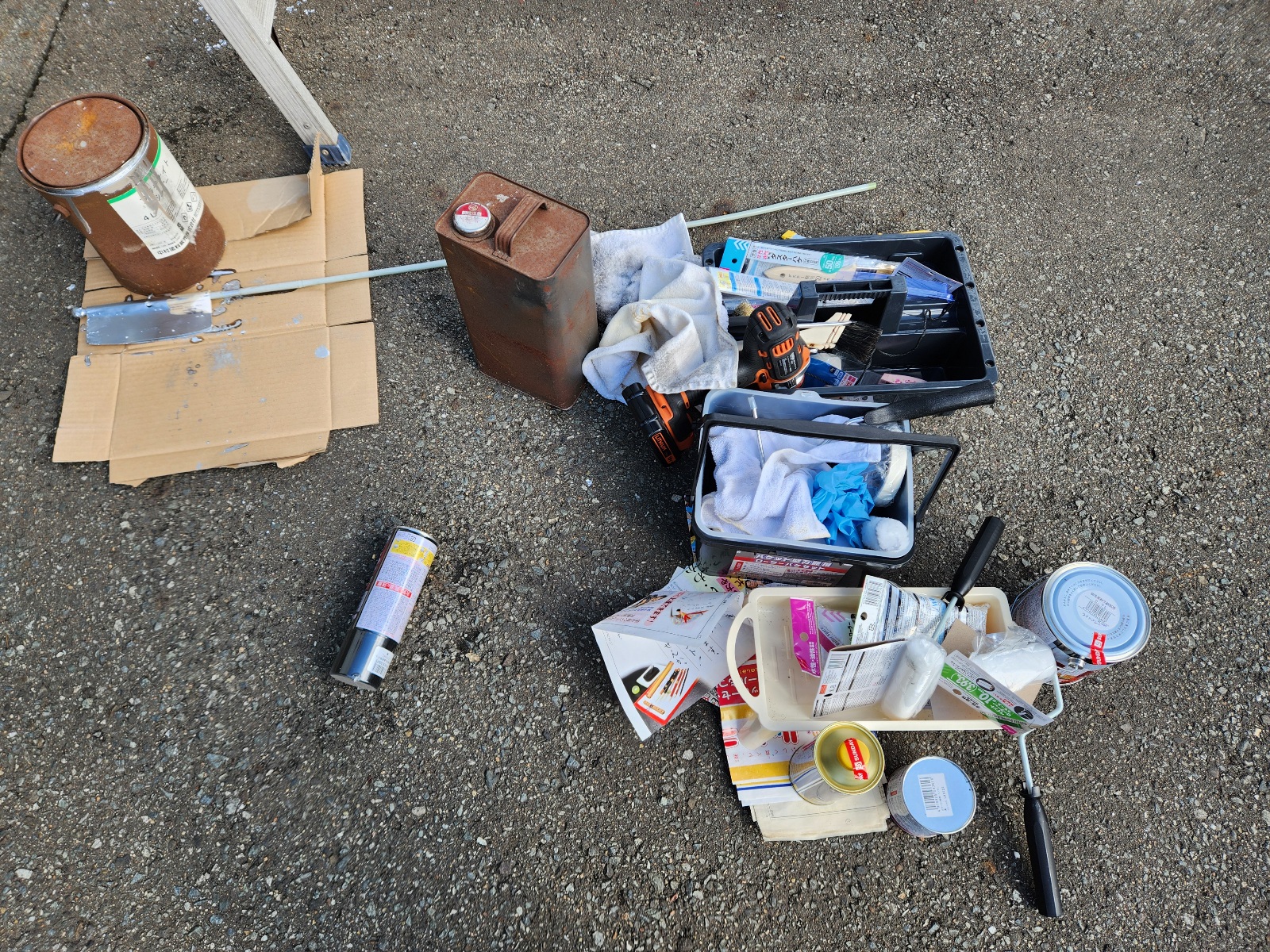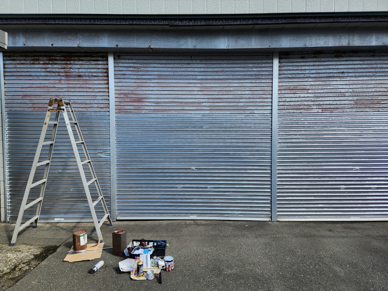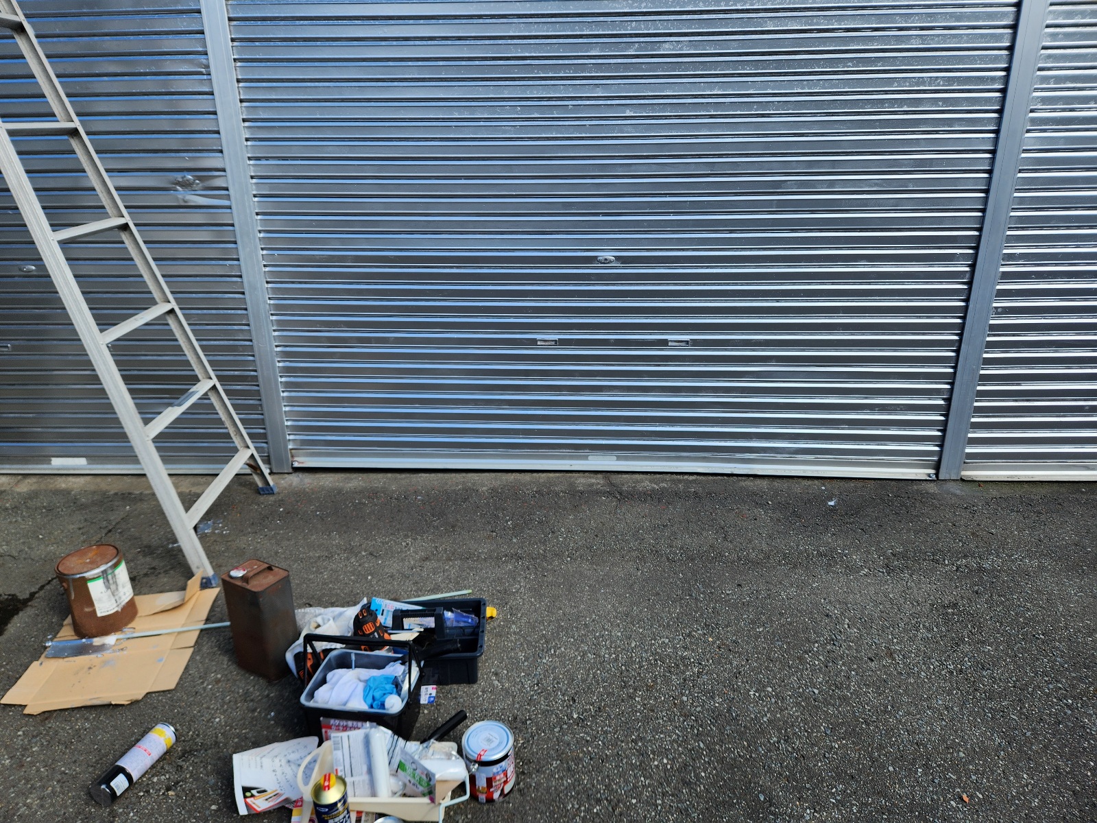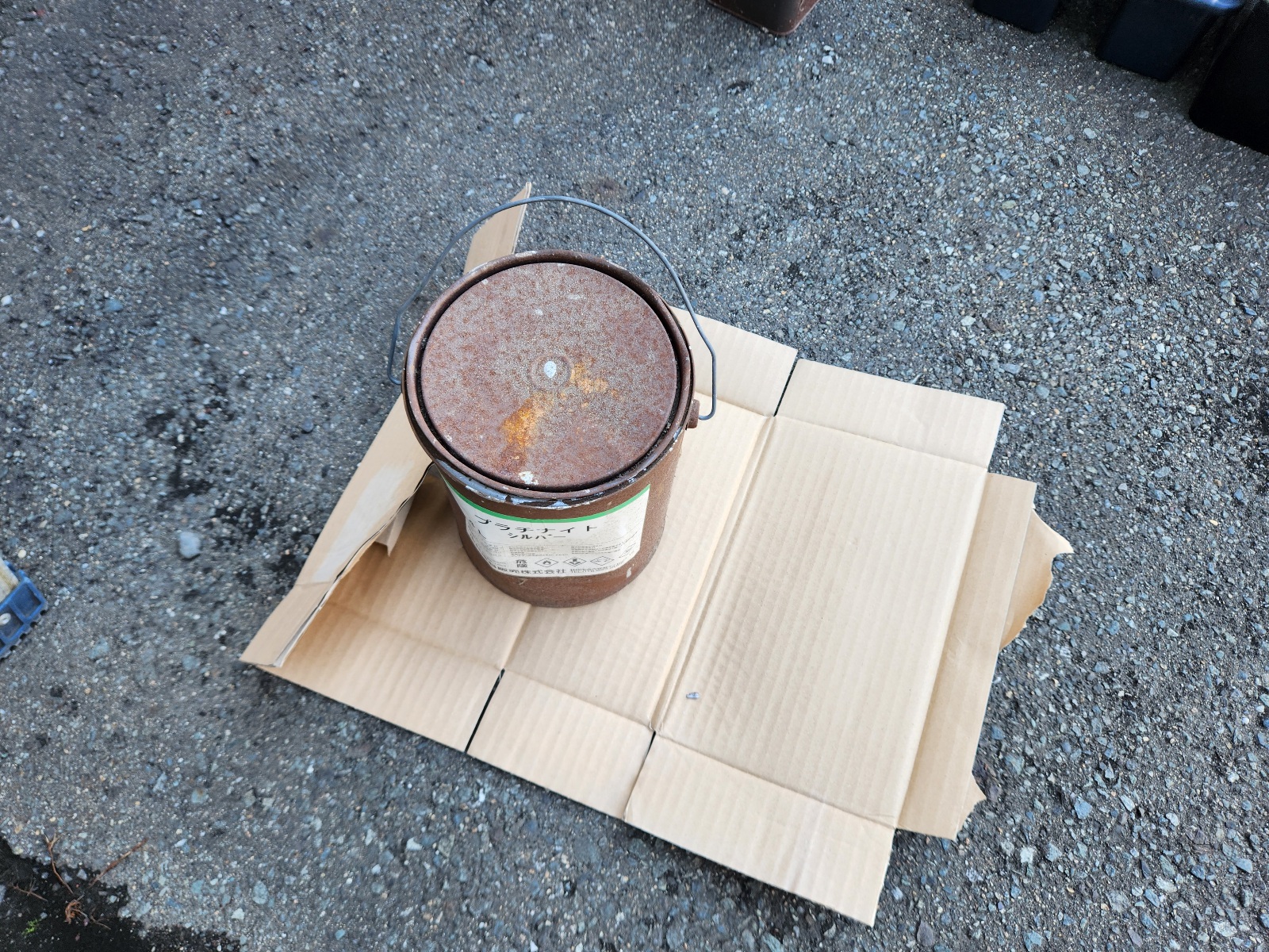 赤く錆びた缶は、10数年前にシャッターを塗った際の塗料とシンナー。