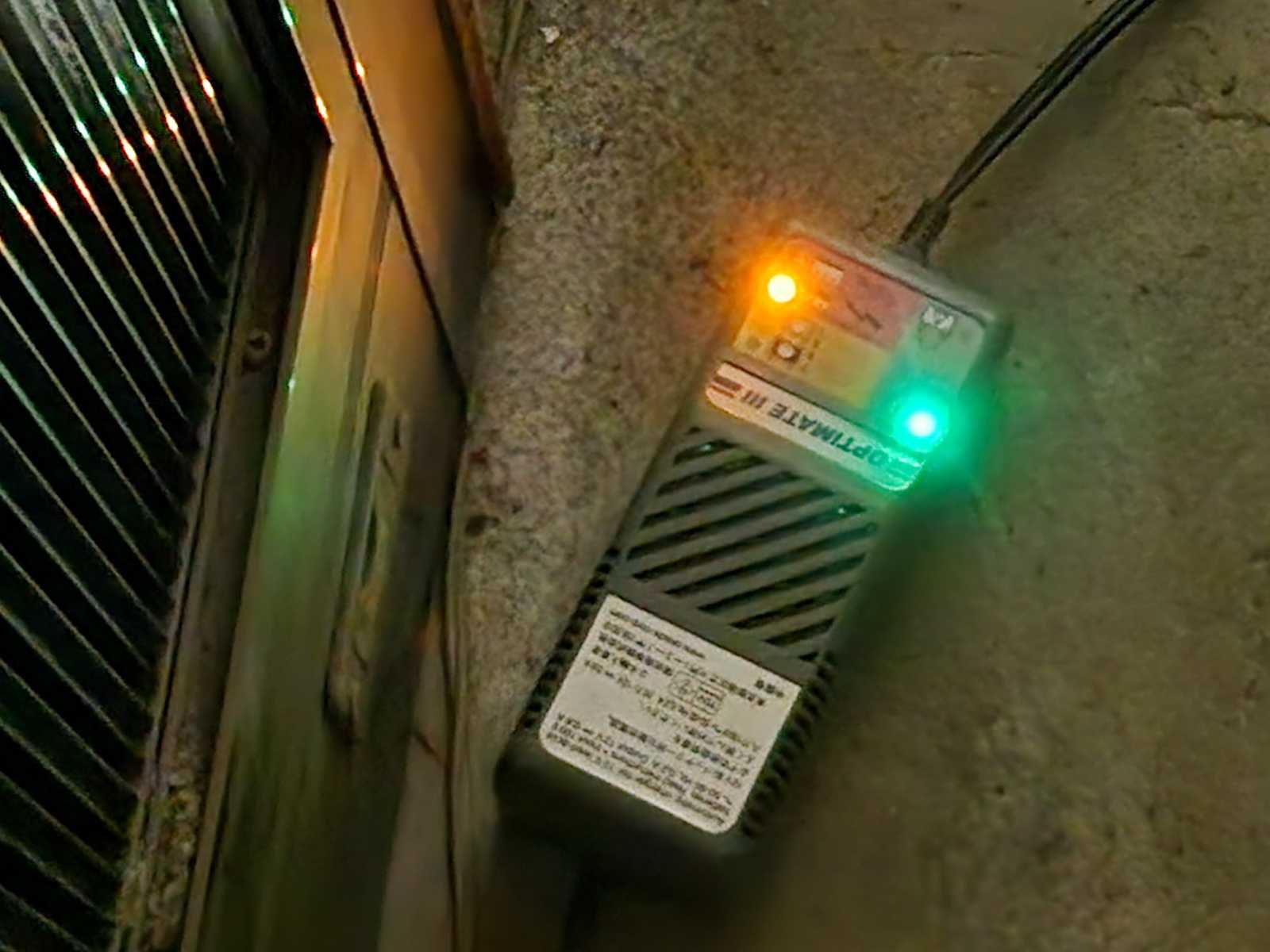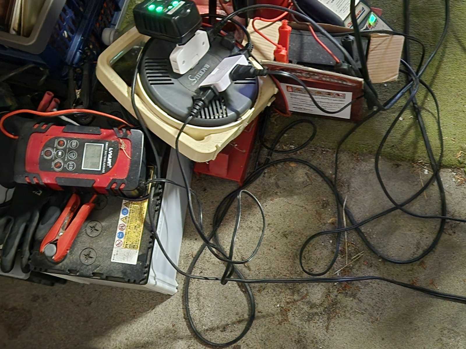 バッテリーにいろいろ繋げてあるので、ケーブルのコネクターではうまく充電がいかないかも知れなくて、ワニ口クリップでそれらを迂回して直マイナスに繋ぎました。プラスは、ごちゃごちゃ繋がったままですが…。