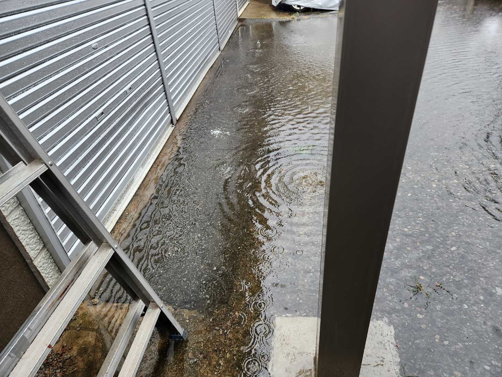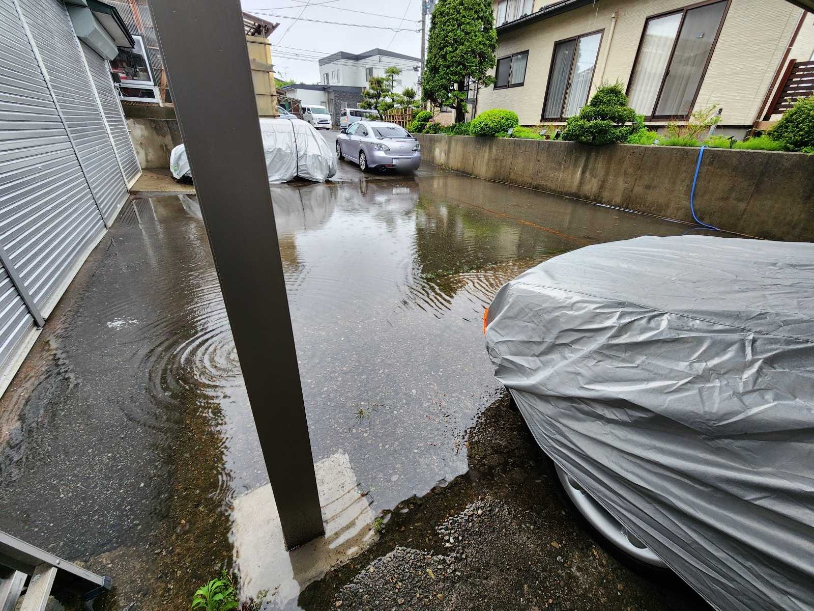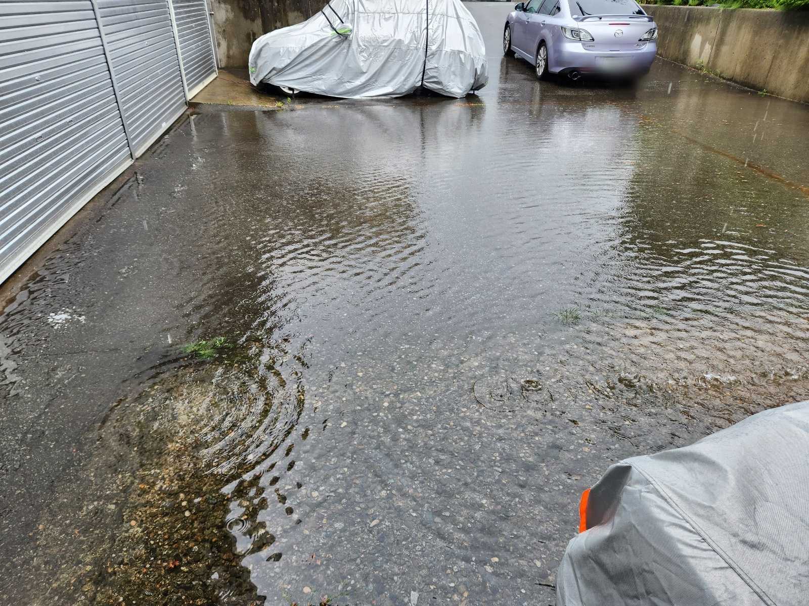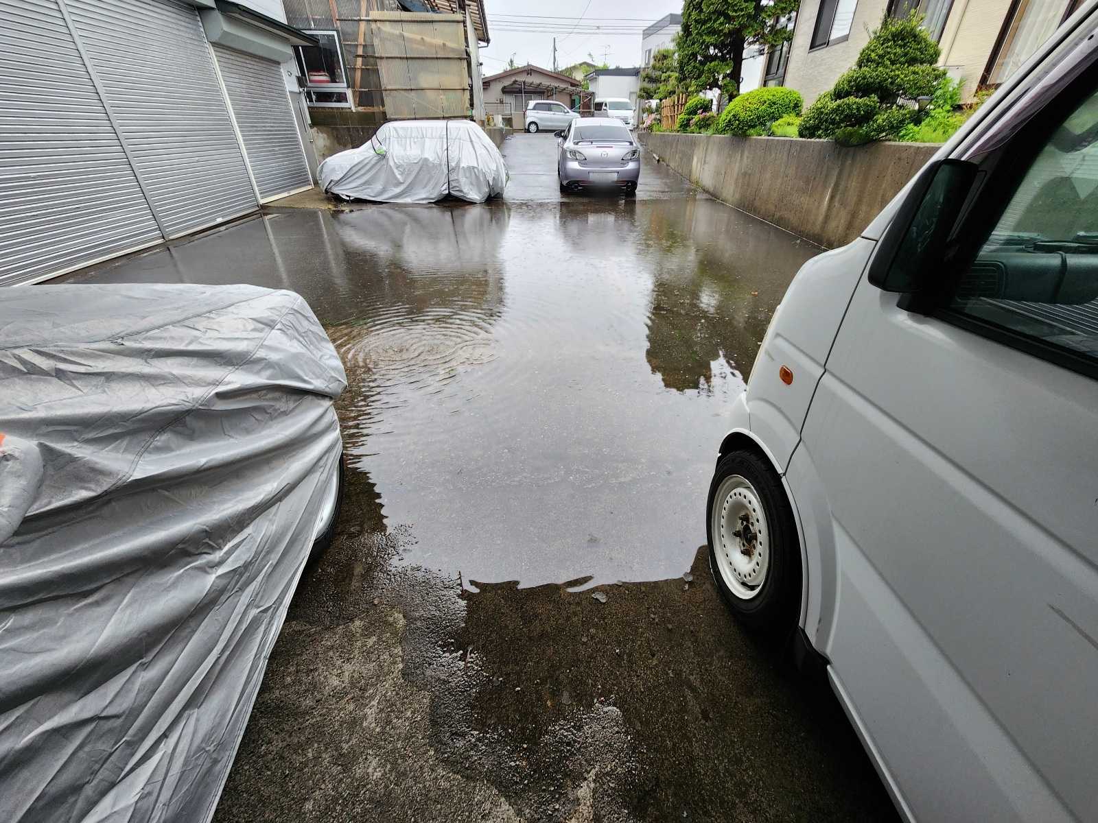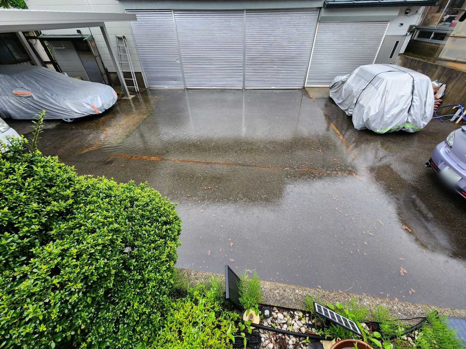 家の建っている場所はちょい高いので、こちらのルートで車庫の入口に行けましたが、さかり降っている時はここも水浸しになってて歩くのがたいへんでした。