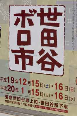 今日は、天気も快晴で今年のボロ市最後の開催日なので出かけてきました。どんな風に撮影しようかと考えて行きましたが無駄だったようで、夕方くらいから始まる渋谷・新宿・お台場・芝公園等のイルミネーションもと欲張りましたがさすがに体もいうことを聞いてくれません。そこで夕食を近くのスパーで買って残りの時間をブログ用画像への編集作業に当てています。編集していて、やっぱりネタとしては物足りないかなぁ???まぁ、年を重ねてくると物欲が足りなくなったせいか展示商品なんかには目が行きません。とにかく人が多くて、早く逃げ出したかったです。 世田谷までの道は環七からバスで若林、世田谷線で世田谷のつもりでしたが、乗るバスを間違えて渋谷へ出てしまいました。仕方ないので、渋谷から世田谷駅近くまでバスに変更。日曜で本数が少なく待ち時間が・・・都内は交通手段がいっぱい歩けど、どれが効率よいかまでは手が回らんです。 開催場所は駒沢公園通りと世田谷通りとの交差点付近から世田谷病院付近ですかね。通称ボロ市通りというところもそうですかね。ちょうど画像に世田谷病院が入っていますが、偶然人通りが途絶えたチャンスに三脚を広げました。結構カメラ持参の方も多かったのですが、いい画像を取れているかまでは???ですね。以前世田谷通りをこの時期、走ったこともあるのですがほんの500メートル進むのに1時間近くかかったこともありました。今日もそんな感じでしたね。そんなこんなで、30分で退散することに・・・ついでに世田谷線とキャロットタワーをちょっとだけ・・・ あ、明日は都内のイルミネーションを撮ってきます。予定は西新宿区・渋谷・南青山・六本木・芝公園・台場(フジTV)をと思っています。でもどうなるかは体調次第です。