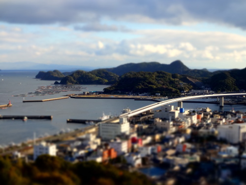 1月5日の牛深の景色です。 高い空から撮影したいなぁ!ダッシュ8の機体を変えるそうだ!フランス製のATR42.48人乗りに 9人増えます。でも、乗ると小型バスぐらいかな? あ、天附に出前のお皿取り、忘れてた。 GOGO! 帰りはハイヤ大橋を登って行きます、旧天附中前から、ここから元下須丸のトントン船が出てましたね。 アクセル全開だ! 下り坂、エンジンブレーキが利かない、で、片手でカシャ!ATですからね。 先ほどまで居た所が、中腹の遠見番所です。