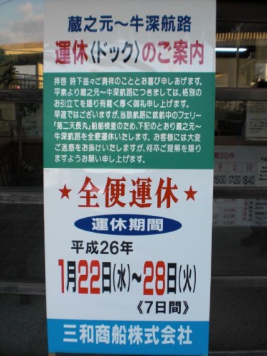 牛深~長島間のフェリー、第二天長丸、年一回の検査で運休ですよ。車検ならぬ、船検ですよお値段を知りたいですね、 長島、出水のシャトルバスは走るのかな?